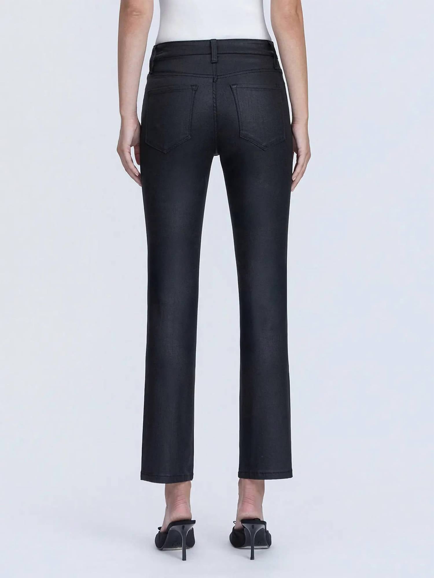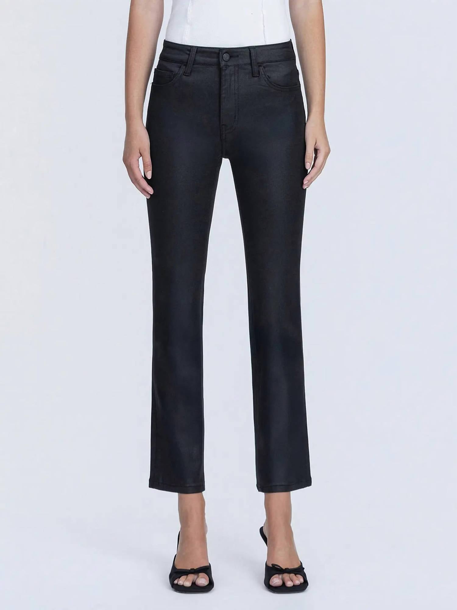 Pair these straight leg jeans with flats, sandals or even heels! You can't go wrong. Introducing the Coated High Rise Slim Straight Jeans by VERVET BY FLYING MONKEY, a perfect blend of comfort and modern style in a solid black hue. Engineered with premium stretch denim, these straight-leg jeans offer a high-rise waist and regular fit that flatters the silhouette. Featuring a button closure, five practical pockets, and a chic coated finish, they are designed with a rise of 10", an inseam of 28", and a leg opening of 14 1/2". Care for these jeans is easy with machine wash and tumble dry. Model is 5'10" and wearing a size 26.