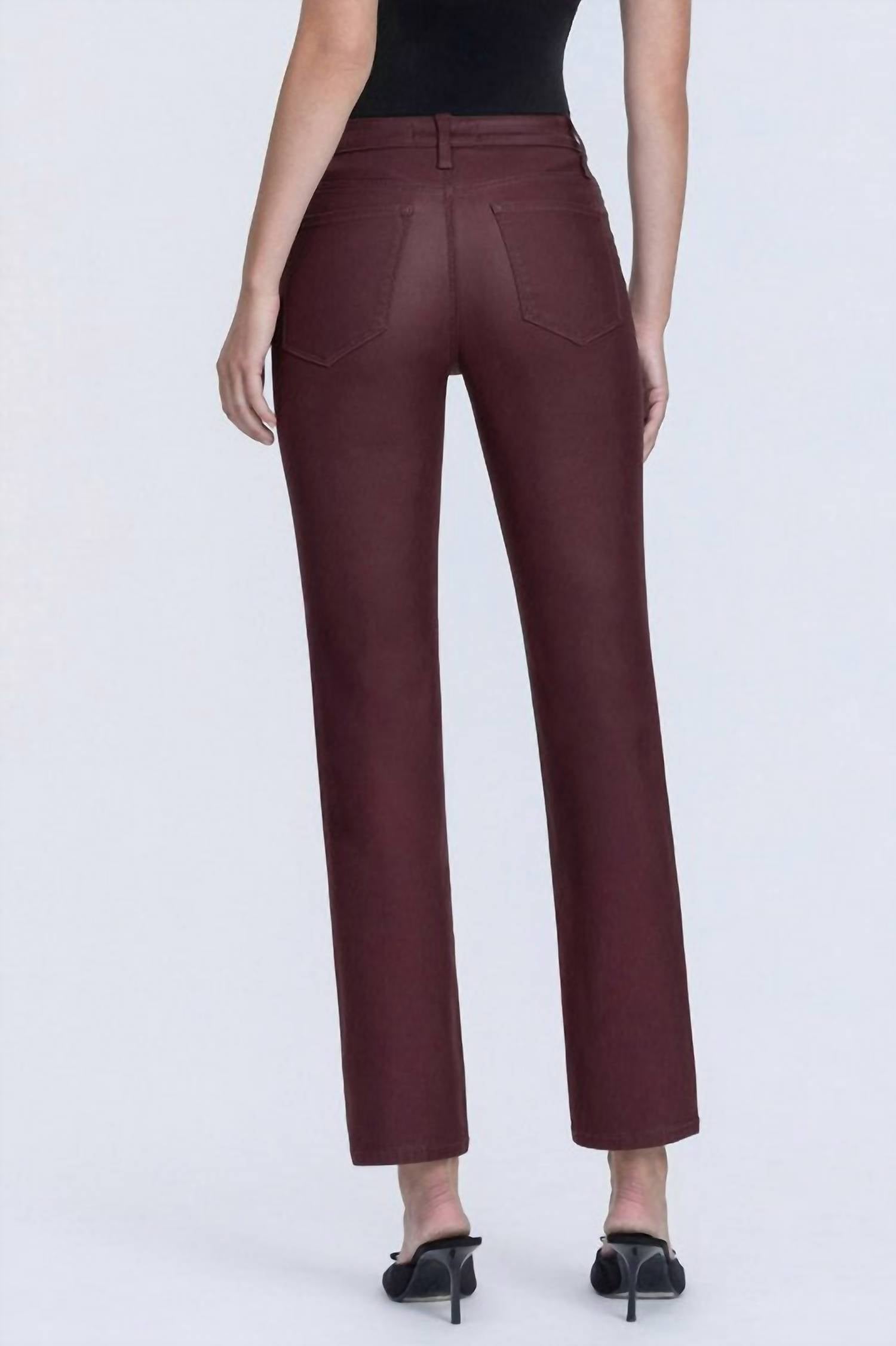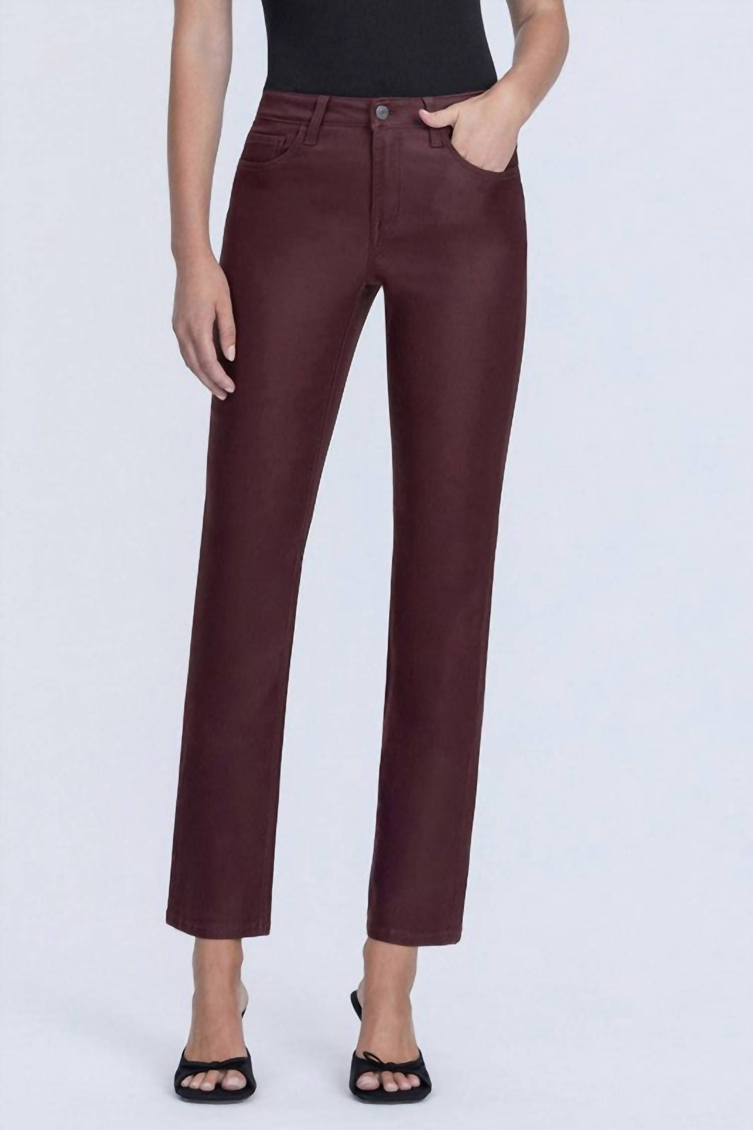 This classic straight leg jean has a perfect fit and goes with just about everything. Elevate your wardrobe with the Winery Coated Straight Leg Jean by VERVET BY FLYING MONKEY, an exquisite choice in wine color for a chic and elegant look. These slim-fit jeans feature a high-rise waist, crafted from a comfort stretch denim composed of 76% rayon, 21% nylon, and 3% spandex. Designed with a 10" front rise, 28" inseam, and a 14 1/2" leg opening, they boast an ankle length and a button closure for a structured finish. Perfect for warm summer vacations, these sleek jeans offer five functional pockets and a solid minimalist style, ideal for fashion-forward women. Model is 5'10" wearing a size 26.