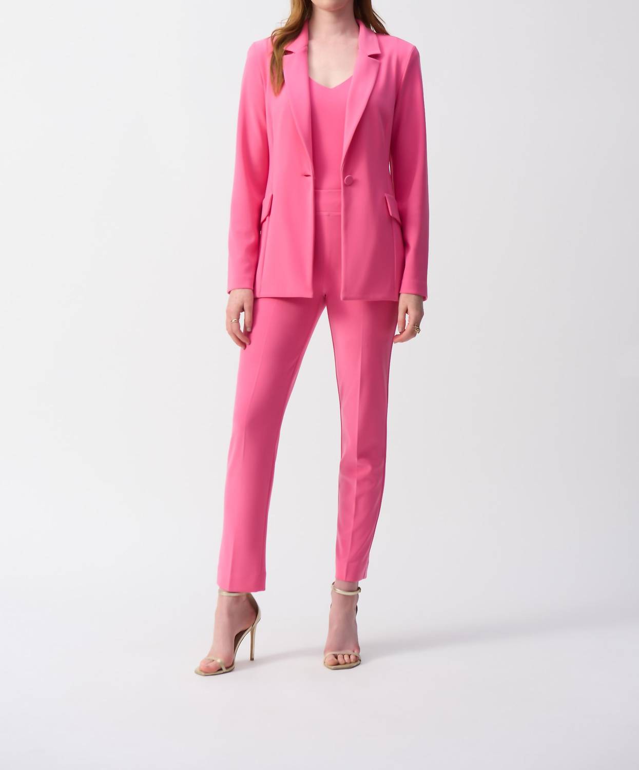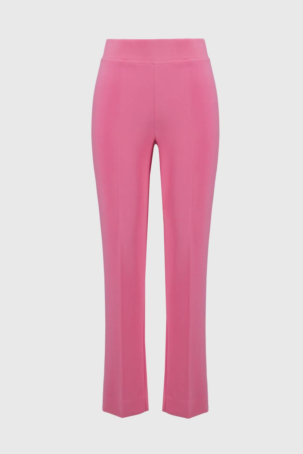 A perfectly tailored straight leg that you'll want in every color! Discover the Classic Straight Pant by Joseph Ribkoff, a stylish choice perfect for both casual and office settings in a striking Bubble Gum hue. These mid-rise, slim-fit, full-length trousers are crafted from a silky knit blend of 95% Polyester and 5% Spandex. Made in Canada, they feature a straight leg style with an elastic waist and pull-on closure. Measuring approximately 27 inches (69 cm) in length and 29 inches (74 cm) inseam for size 12, they combine versatility with a feminine flair. Care: Hand wash and line dry.