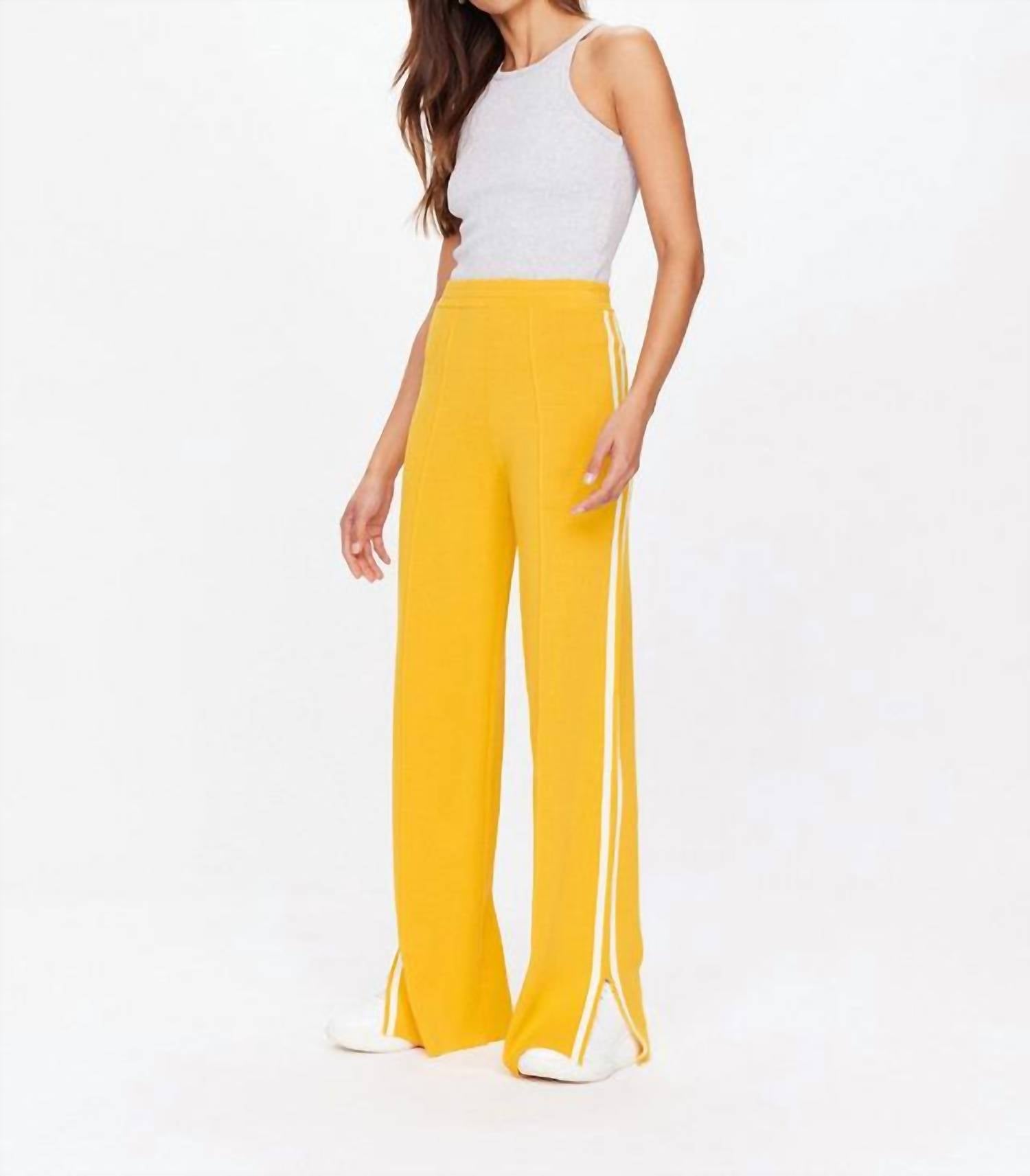 This straightleg pant is both stylish and comfortable. Did we mention the fit is perfection? Elevate your sporty style with THE UPSIDE Dunes Freya Knit Pants in vibrant marigold. These relaxed fit, straight leg pants boast a chic knitted design with white side stripes and feature an elasticated waistband for comfort. Crafted from a 65% Viscose and 35% Polyamide blend, they include short splits at the hem and an embroidered tonal arrow logo at the back. Closure: Pull on. Care: Cold gentle machine wash separately, reshape whilst damp, dry flat in shade, cool iron, do not tumble dry.