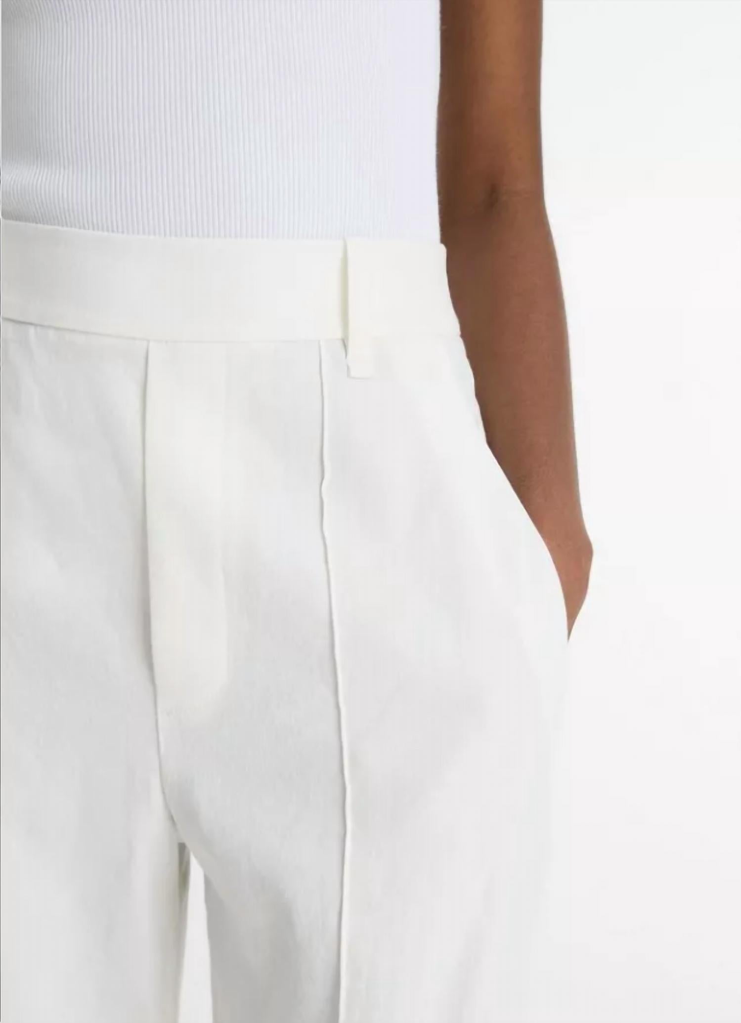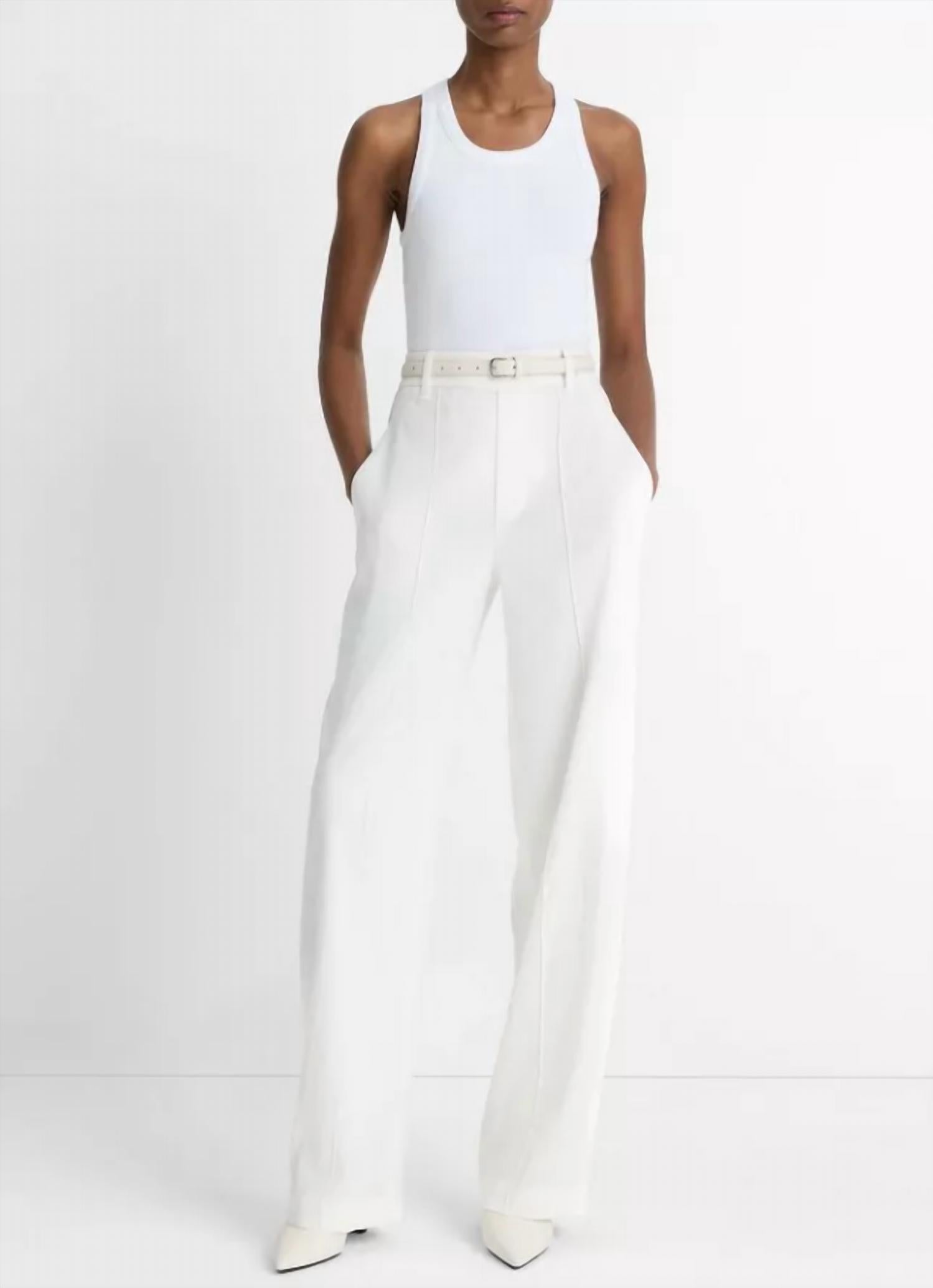 A straightleg pant that workes season after season. Dress these up with your favorite blouse or keep it casual with your go-to tee. Experience the effortless elegance of the High Rise Pull On Linen Pant by Vince, crafted in a sophisticated Off White hue. These women's pants feature a high rise waist and a straight leg design with convenient pull-on closure. Made from a high-quality Linen/Rayon blend, they ensure a flattering classic fit with solid pattern details. With a 32.5-inch inseam, these pants are perfect for any occasion, and require hand washing and line drying for easy care.