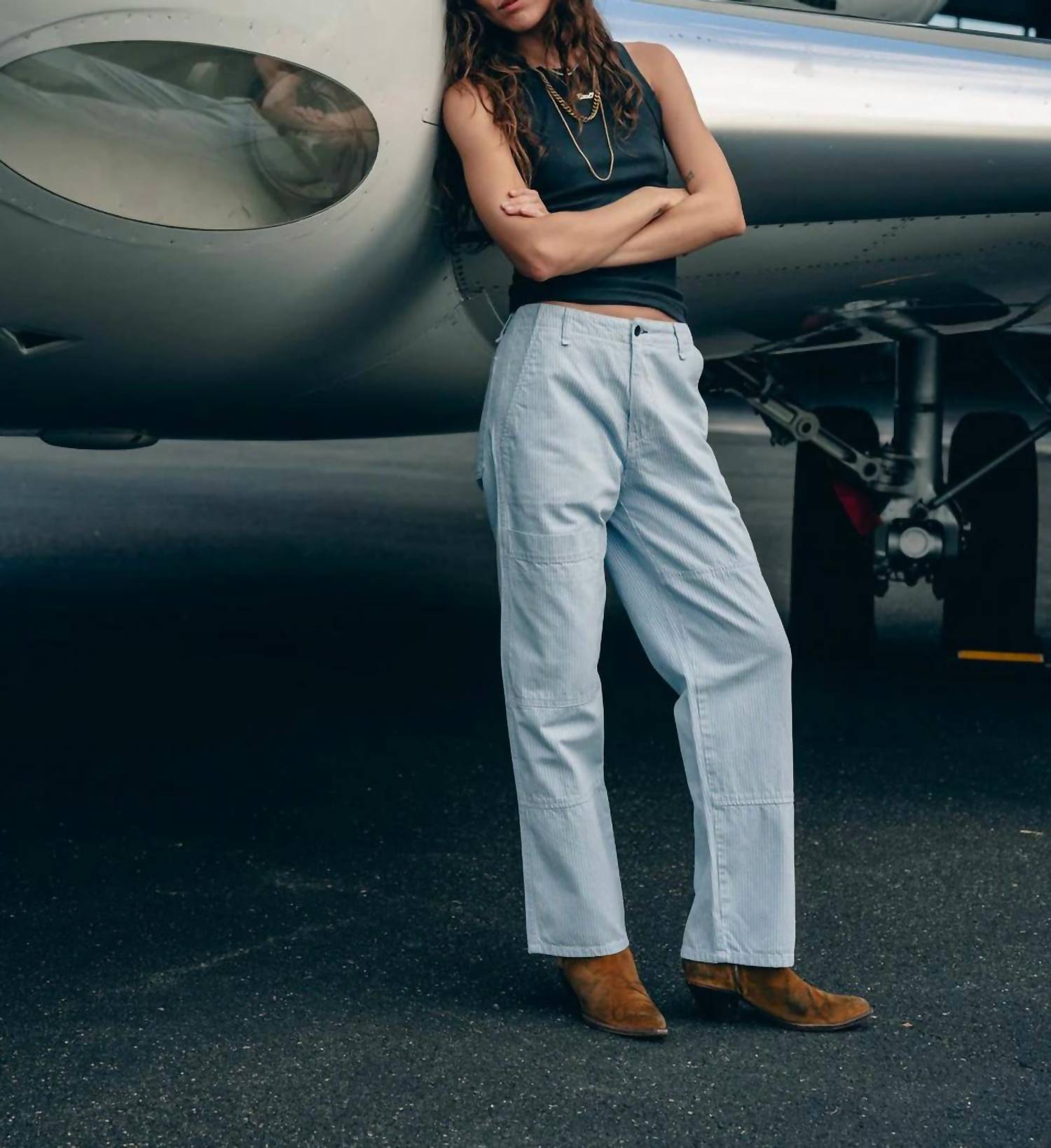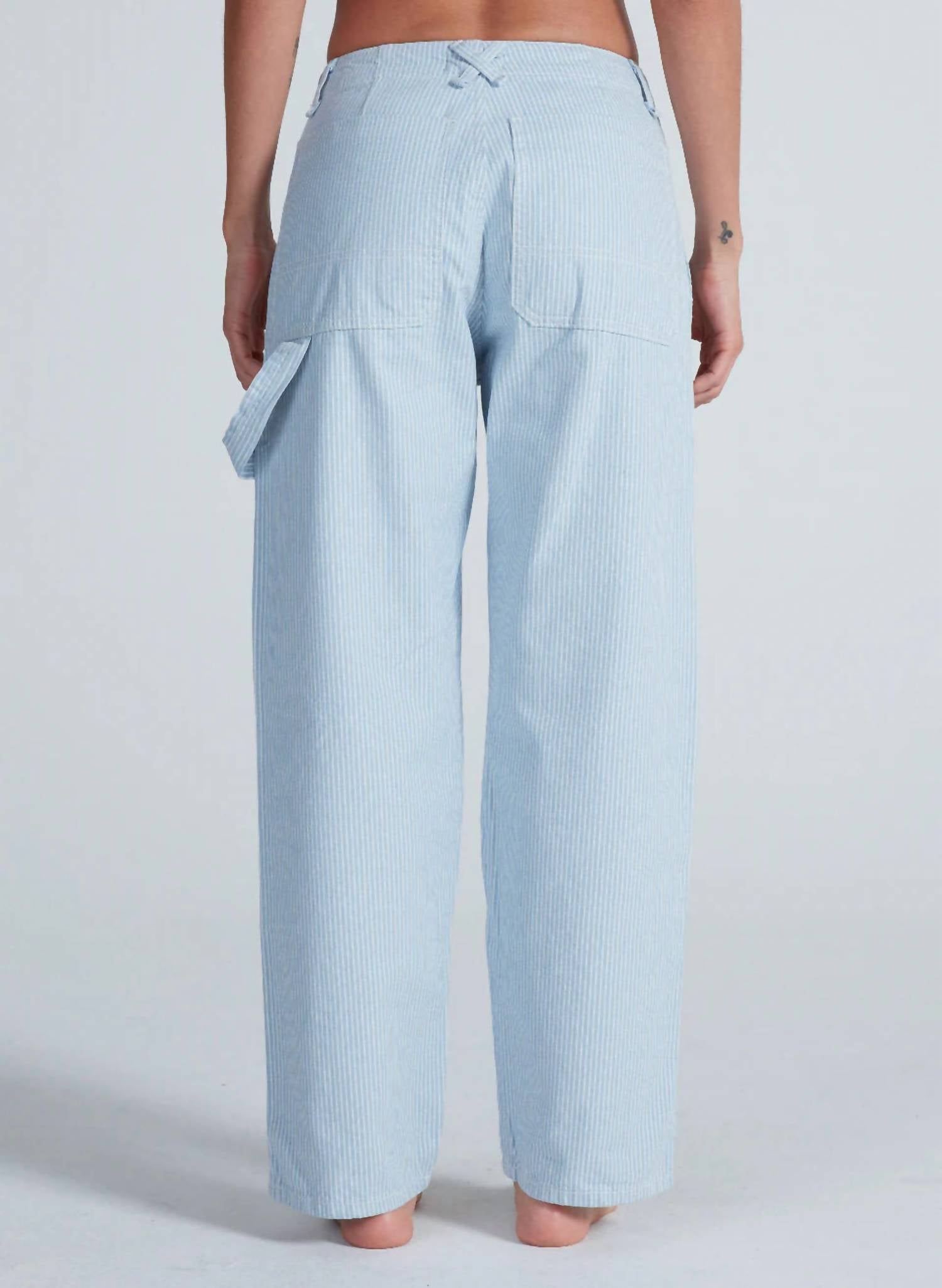 A straightleg pant that workes season after season. Dress these up with your favorite blouse or keep it casual with your go-to tee. Introducing the ASKK NY Blue Stripe Carpenter Pants, a chic balance of style and utility. These pants boast a high rise with an 11.5" rise, 29" inseam, and a 17" leg opening, offering a relaxed straight leg fit. Composed of 100% lightweight Japanese railroad stripe cotton, they feature traditional carpenter details like a hammer loop and back patch pockets. Closure: Button closure. Made in Los Angeles, care for them with a machine wash cold separately and avoid tumble drying. The model, standing at 5'9", is wearing size 25.