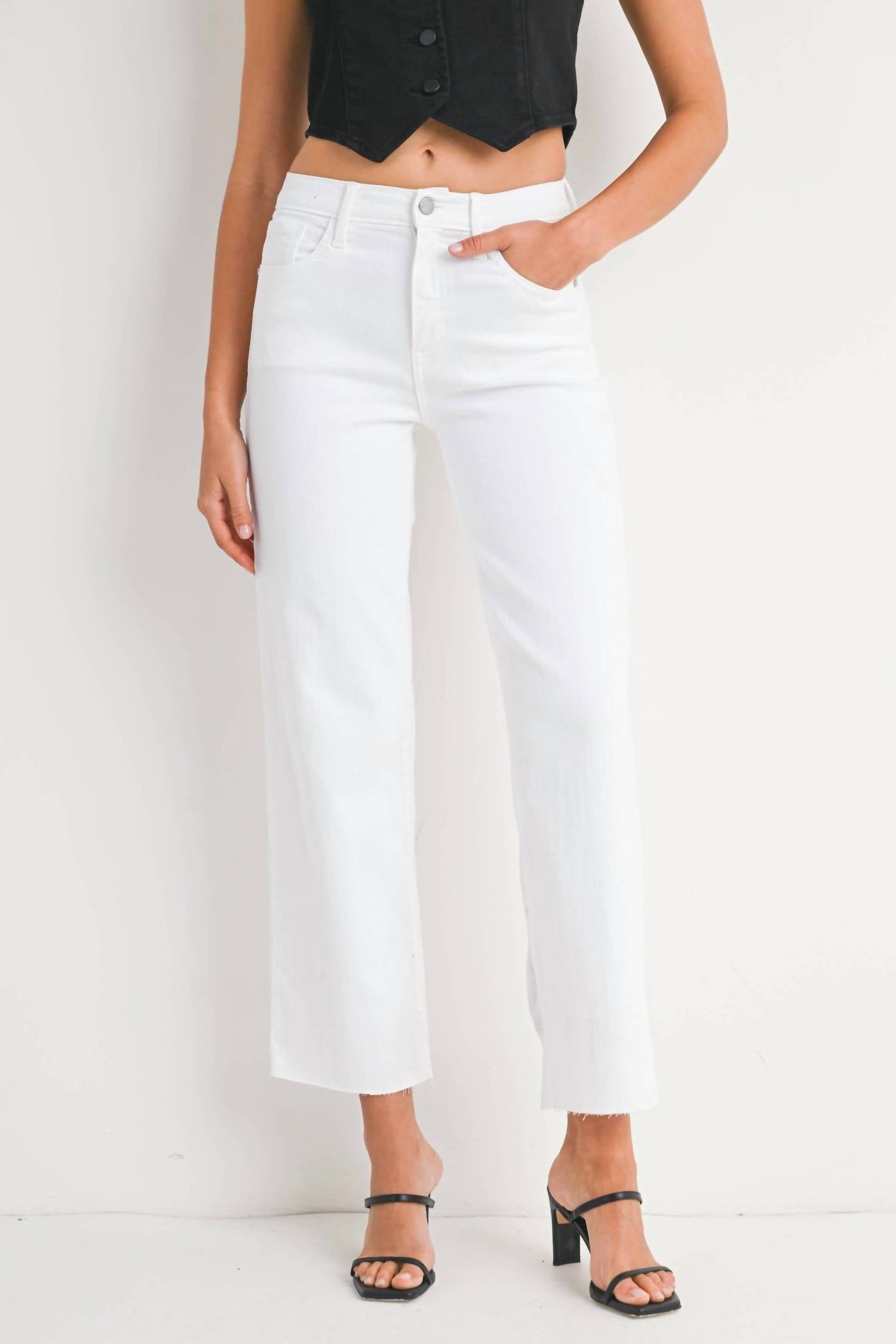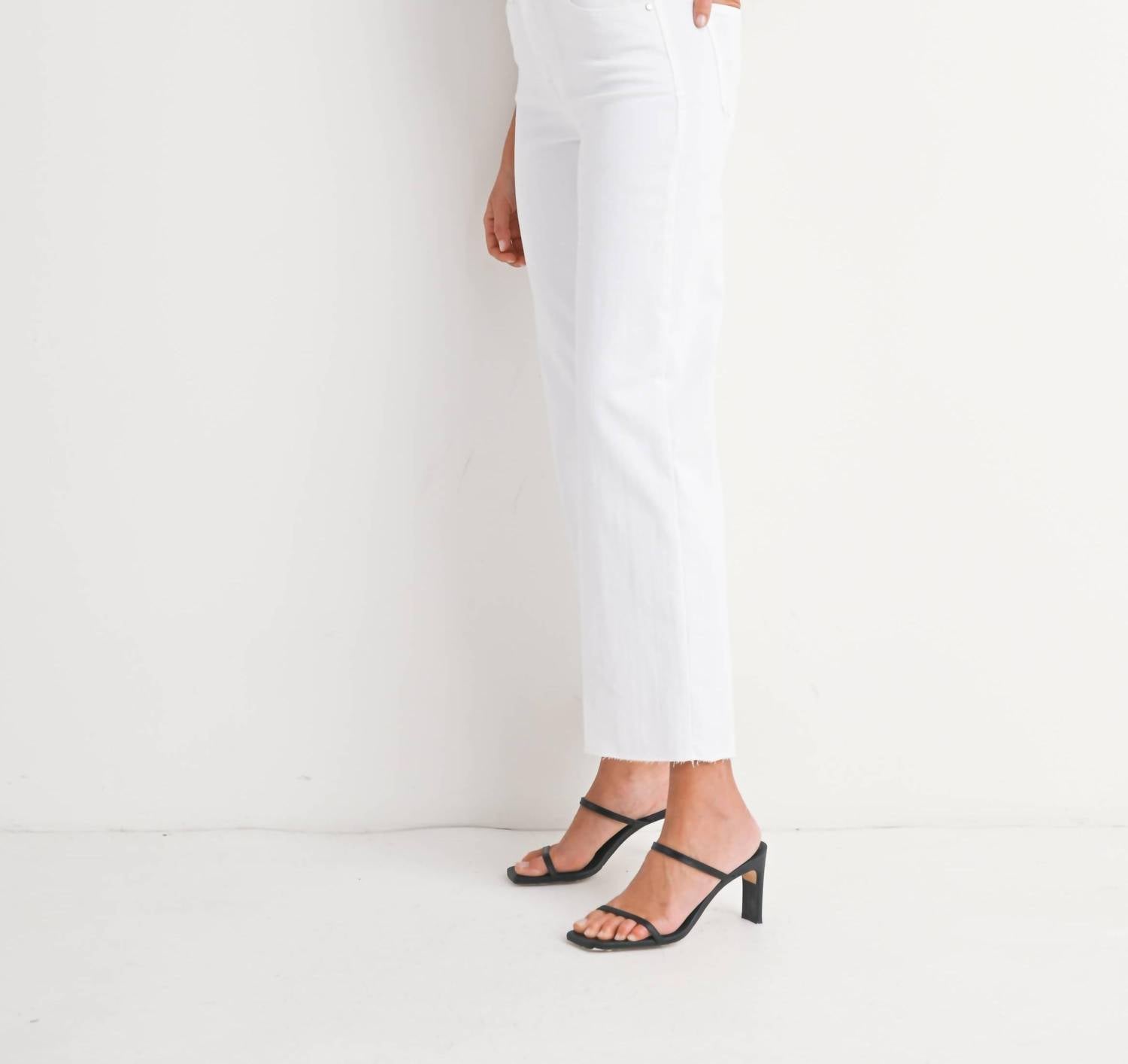 A straightleg pant that workes season after season. Dress these up with your favorite blouse or keep it casual with your go-to tee. Step out in style with the Classic Straight Optic White pants by Just Black Denim, crafted from a comfortable cotton blend. These striking straight leg pants feature a high 10" rise and a chic 28" inseam, complete with a raw scissor-cut hem for a modern touch. Made in the US, they offer a slim fit with a convenient button closure and handy pockets. Care is hassle-free with machine wash instructions for easy maintenance.