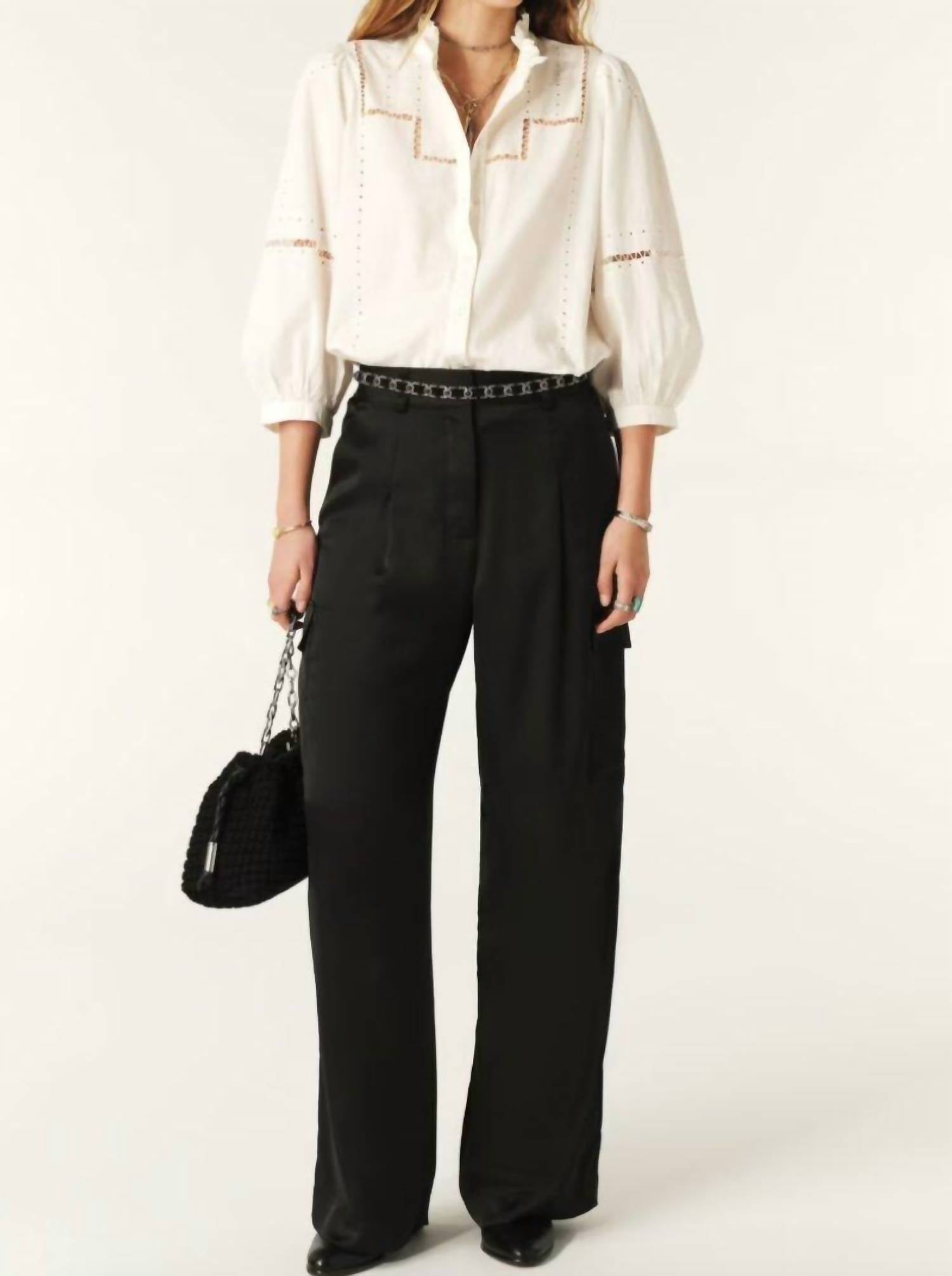 A straightleg pant that workes season after season. Dress these up with your favorite blouse or keep it casual with your go-to tee. Introducing the Cary Straight Leg Pants by ba&sh, a sophisticated choice for workwear or a dinner party. These high-rise, relaxed-fit pants come in classic black with a straight leg style, featuring a hook and eye closure for a clean finish. Crafted from 100% polyester, these pants are designed with practicality in mind, offering side pockets, cargo-style side patch pockets, and piped back pockets. Not only do they provide a modern solid pattern, but they're also perfectly suited for the spring season.