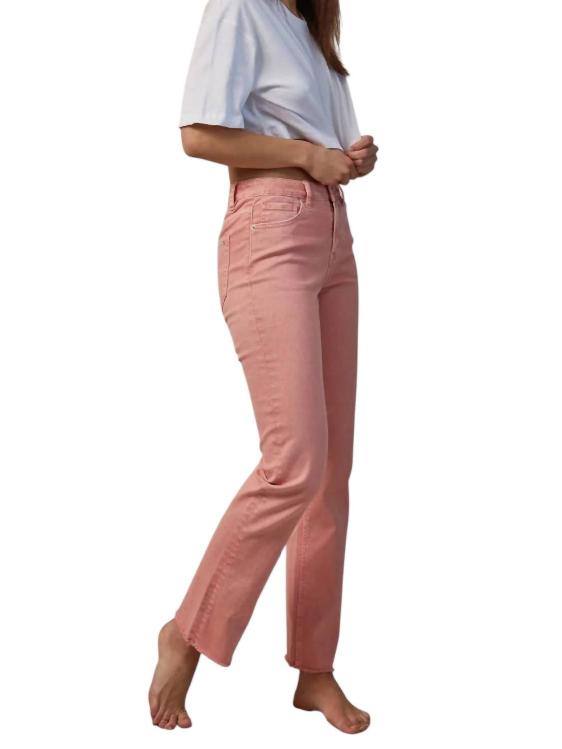 A straightleg pant that workes season after season. Dress these up with your favorite blouse or keep it casual with your go-to tee. Elevate your style with the Peachy Pink Vintage Garment Dyed Pants by Mica Denim, crafted for a vintage charm with a modern twist. These women's straight leg jeans feature a high rise for a flattering fit and include a comfortable blend of 93% cotton, 5% polyester, and 2% spandex. The jeans feature a front rise of 10", an inseam of 28", and a leg opening of 14 3/4", offering a solid pattern design perfect for spring occasions like a dinner party. Closure: Button closure.