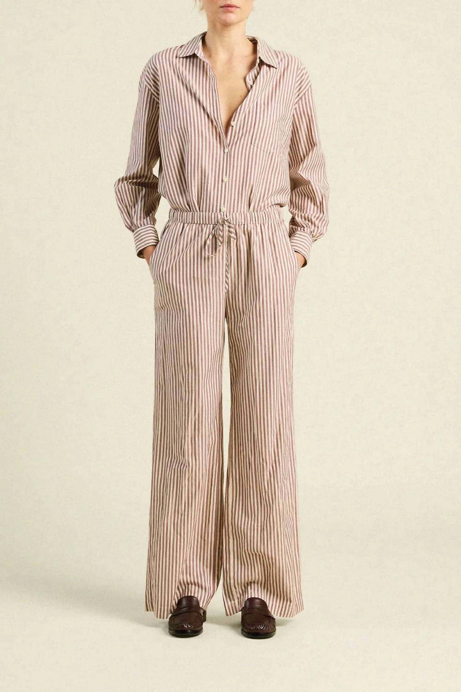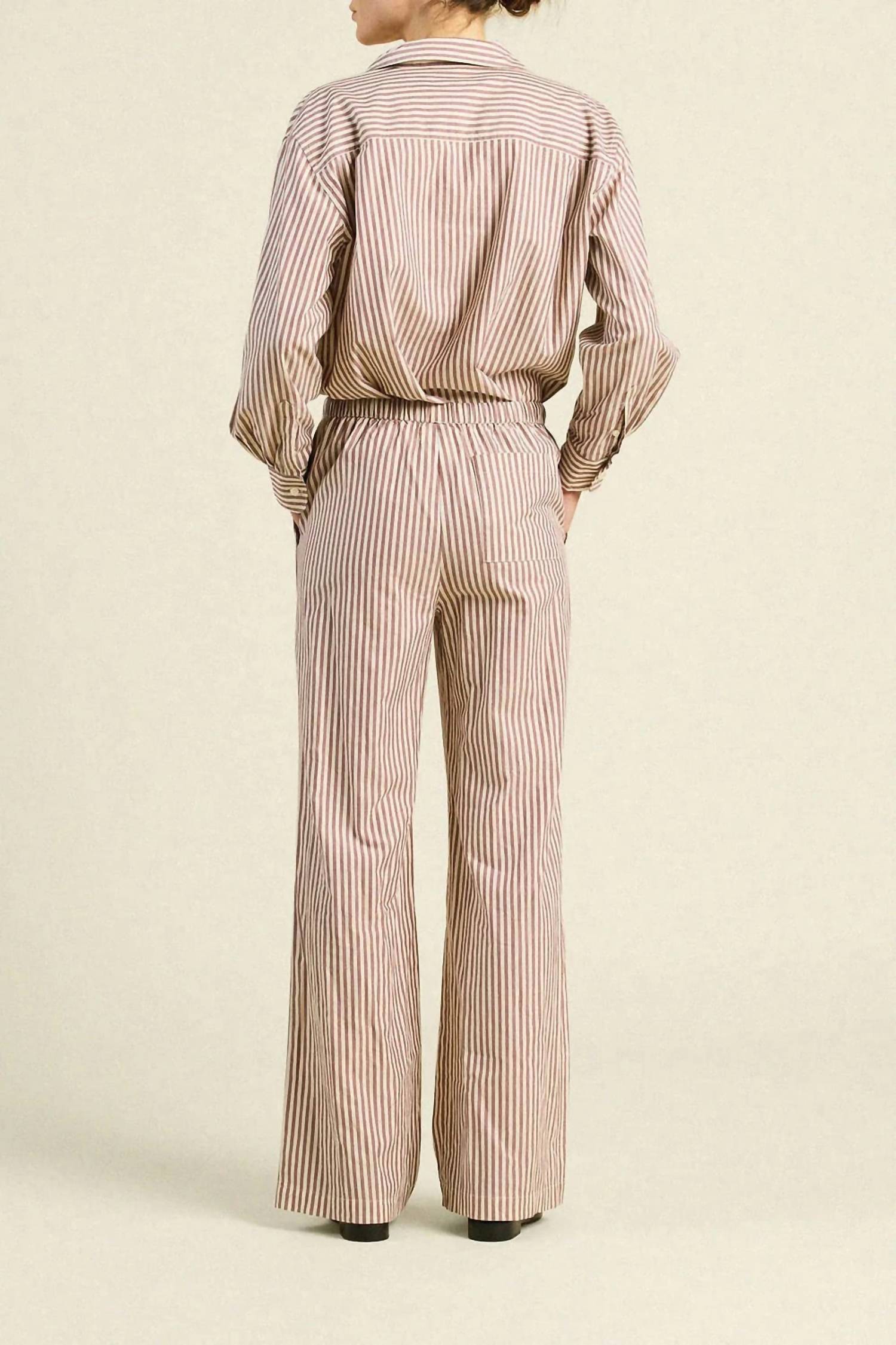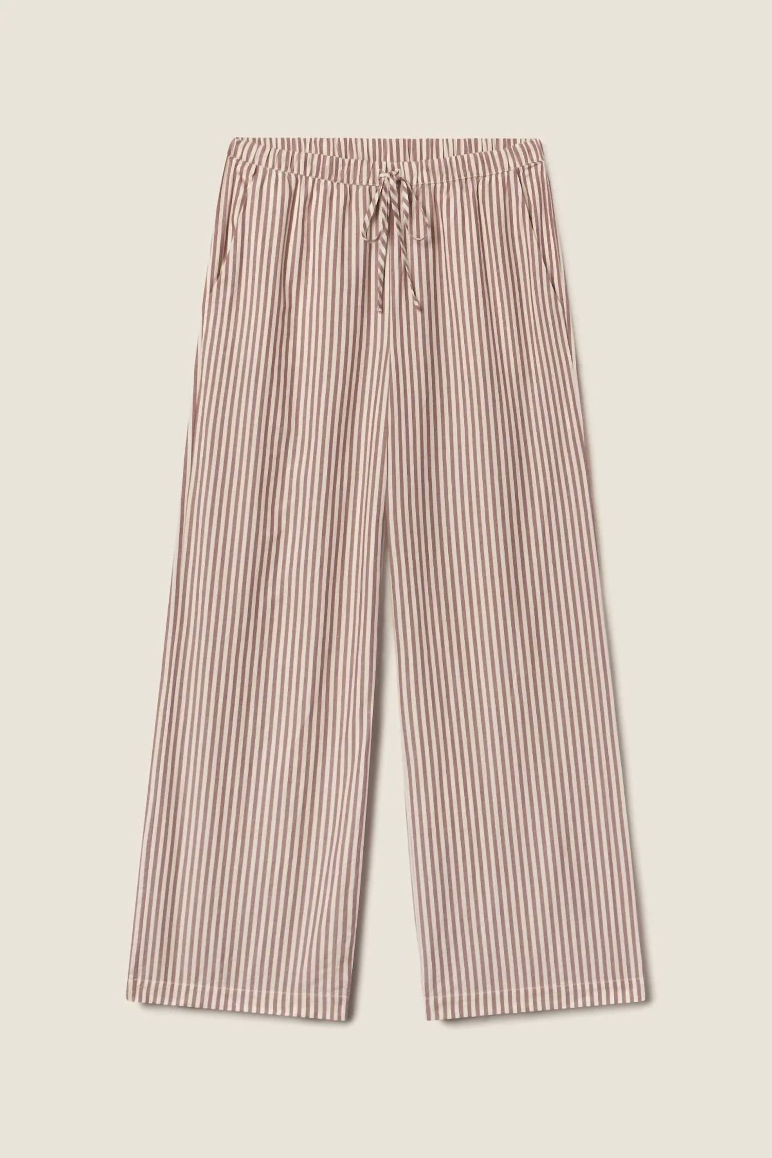 A straightleg pant that workes season after season. Dress these up with your favorite blouse or keep it casual with your go-to tee. Discover the Vera Stripe Pants by TROVATA, a chic addition to your summer wardrobe in burgundy stripe. These full-length, straight-leg pants feature a relaxed fit with a flattering high rise and a slim tie closure coupled with elastic for added comfort. Made from a breathable cotton blend composed of 70% Cotton and 30% Viscose, these pants are designed in California, bringing a touch of laid-back elegance to any vacation or minimalist ensemble. They include practical side pockets and are easy to care for with machine wash cold and tumble dry low instructions.