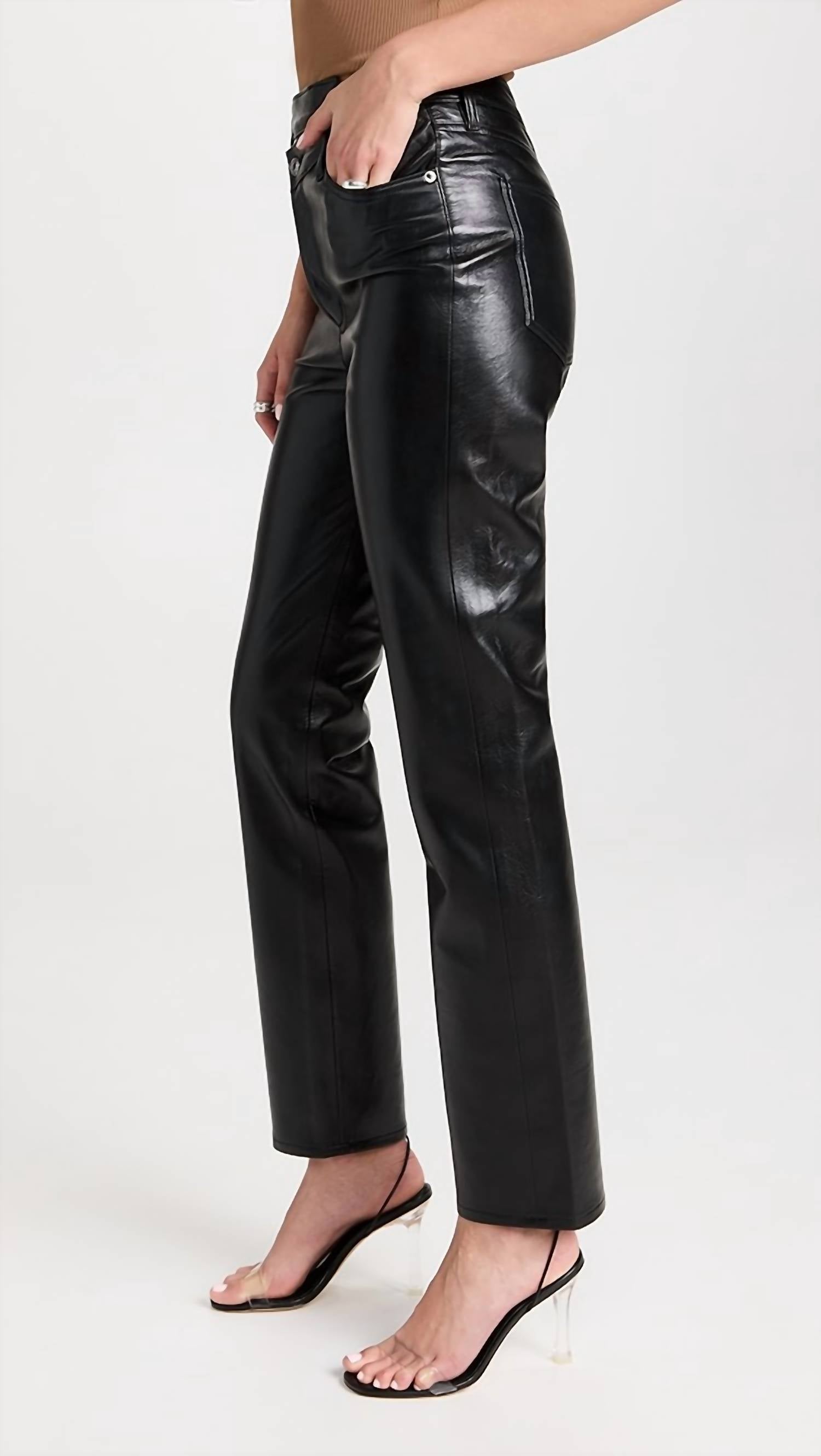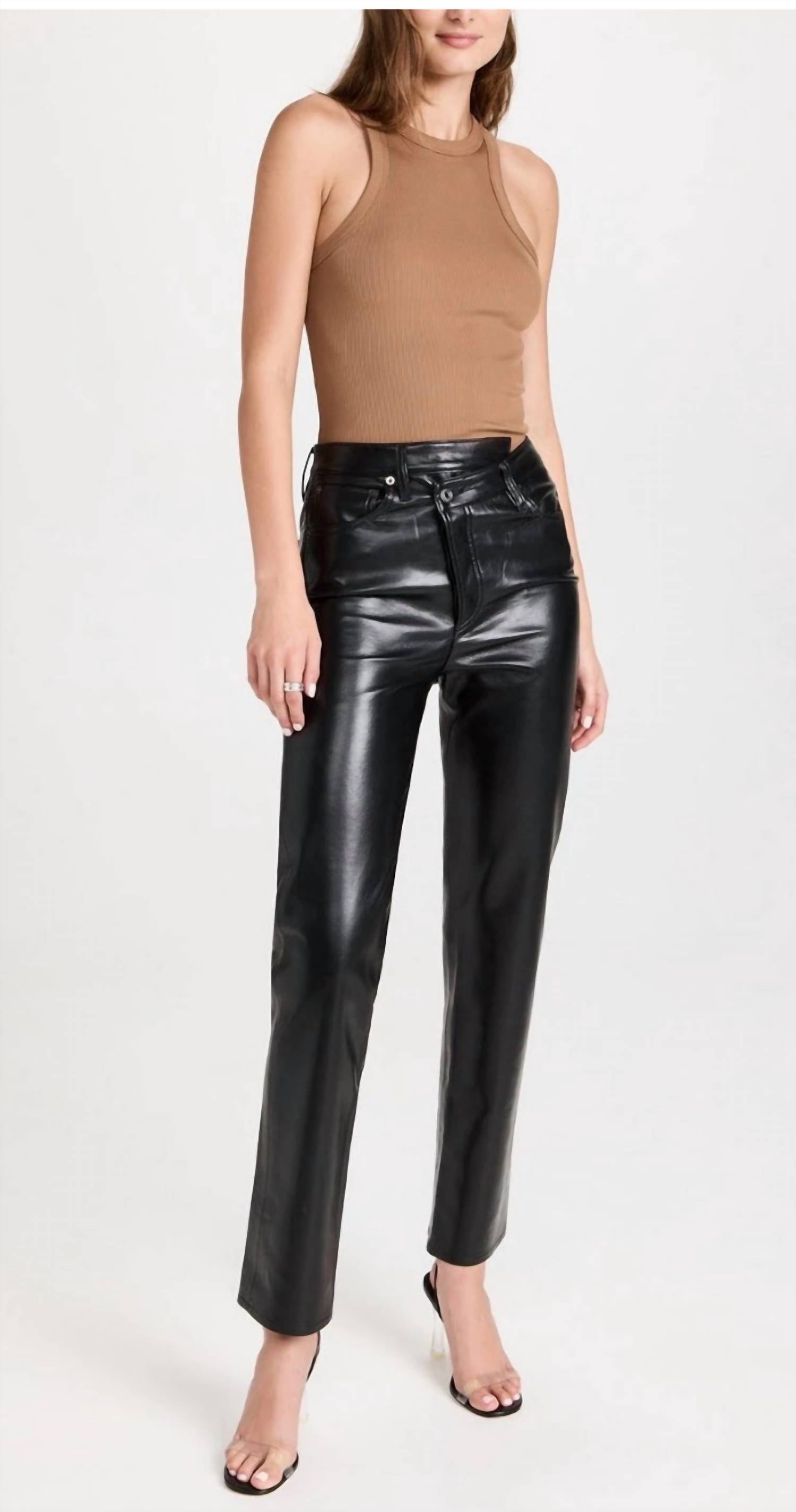 A perfectly tailored straight leg that you'll want in every color! Elevate your wardrobe with the AGOLDE Leather Crisscross Straight Pants, a chic choice for any cocktail party. These relaxed fit pants are crafted from a luxurious mid-weight, non-stretch viscose blend, including 50% cowhide, for a sophisticated look. Designed with a crossover waistband and button fly, they provide a flattering high rise and straight leg silhouette. Made in the USA, these pants feature five-pocket styling and come in a sleek black monochrome pattern. Care: Dry clean only.