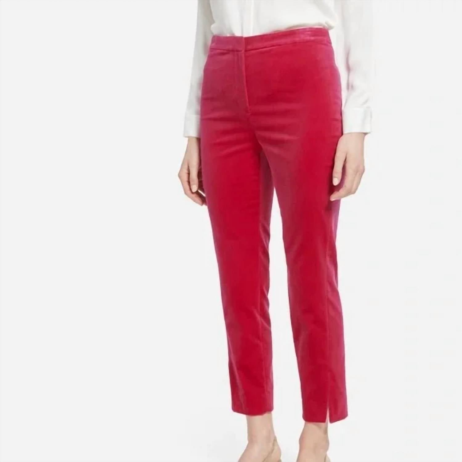 A straightleg pant that workes season after season. Dress these up with your favorite blouse or keep it casual with your go-to tee. Elevate your wardrobe with these stunning hot pink velvet ankle pants, perfect for adding a touch of luxurious texture and vibrant color to any outfit. Crafted from soft, plush velvet in a striking hot pink/cranberry hue, offering a rich visual appeal and comfortable feel. Designed with a modern ankle length, ideal for showcasing your favorite footwear. Designed with a straight leg and flat front for a sleek and flattering silhouette. 99% Cotton, 1% Elastane Dry clean Inseam 26.5"