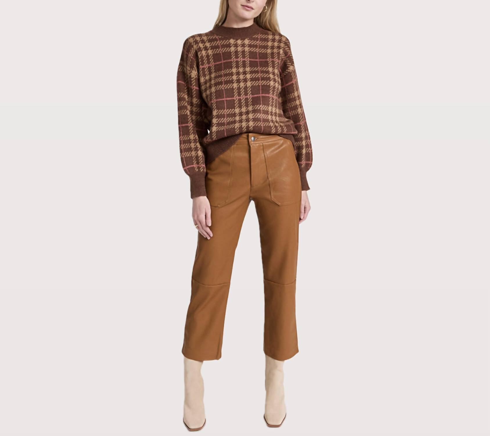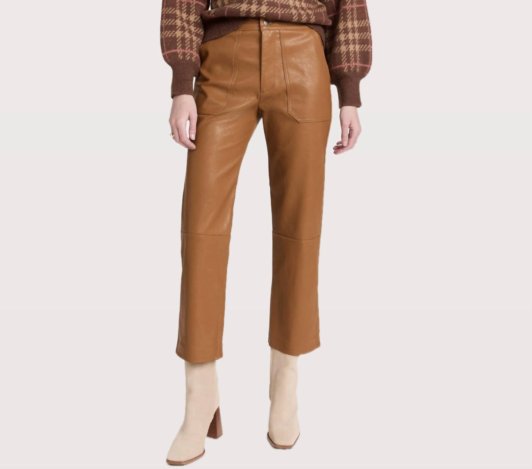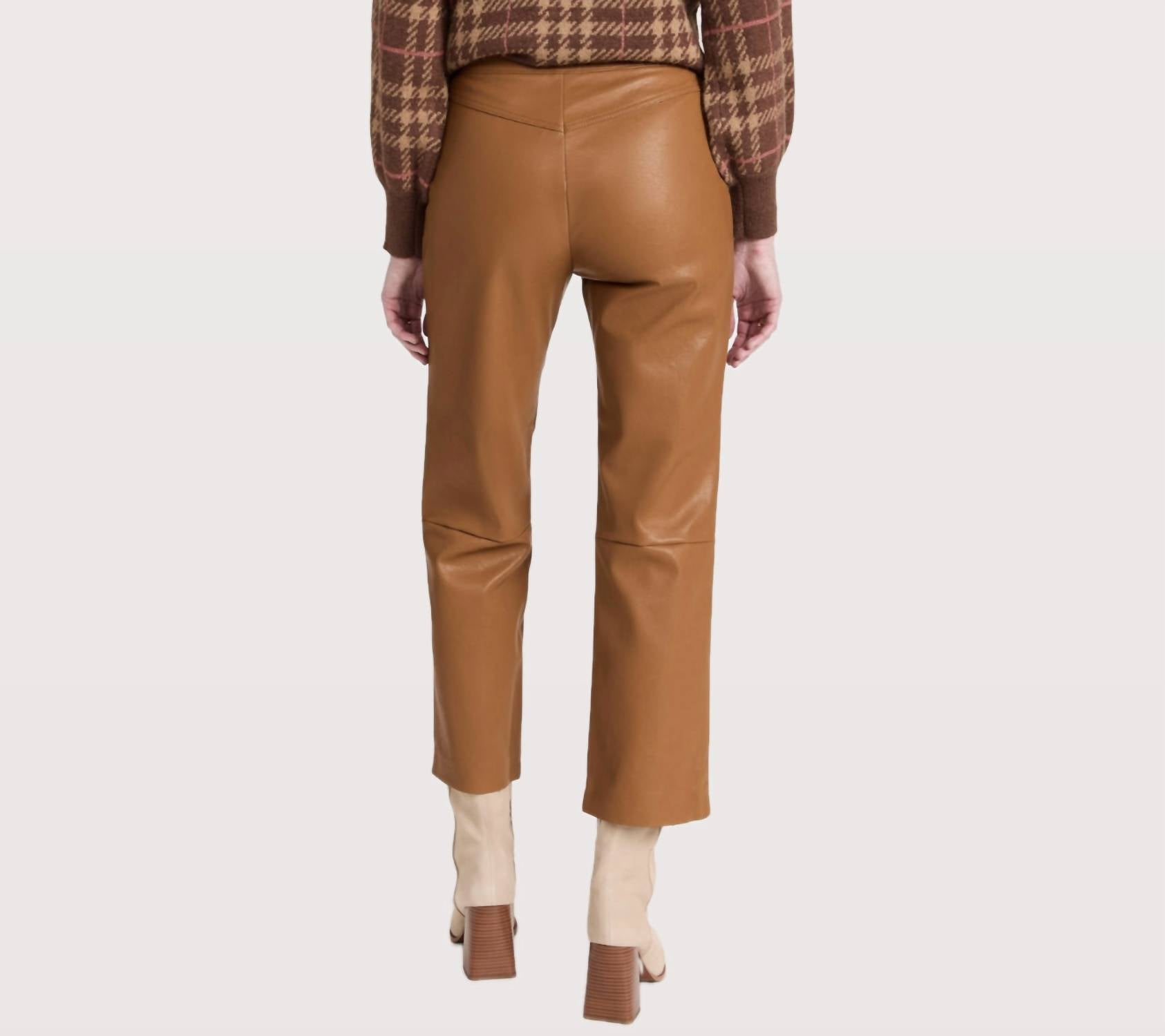 A perfectly tailored straight leg that you'll want in every color! Elevate your holiday wardrobe with the Rune Faux Leather Pant by LNA, designed in a sophisticated toffee hue. Featuring a high-rise waist and classic straight-leg silhouette, these pants offer a minimalist style perfect for fall occasions. Crafted from mid-weight, low-stretch polyurethane with a cozy fleece backing, it includes practical slant front pockets and secure button closure with a zip fly. Originating from China, these pants require spot cleaning to maintain their sleek faux-leather look.