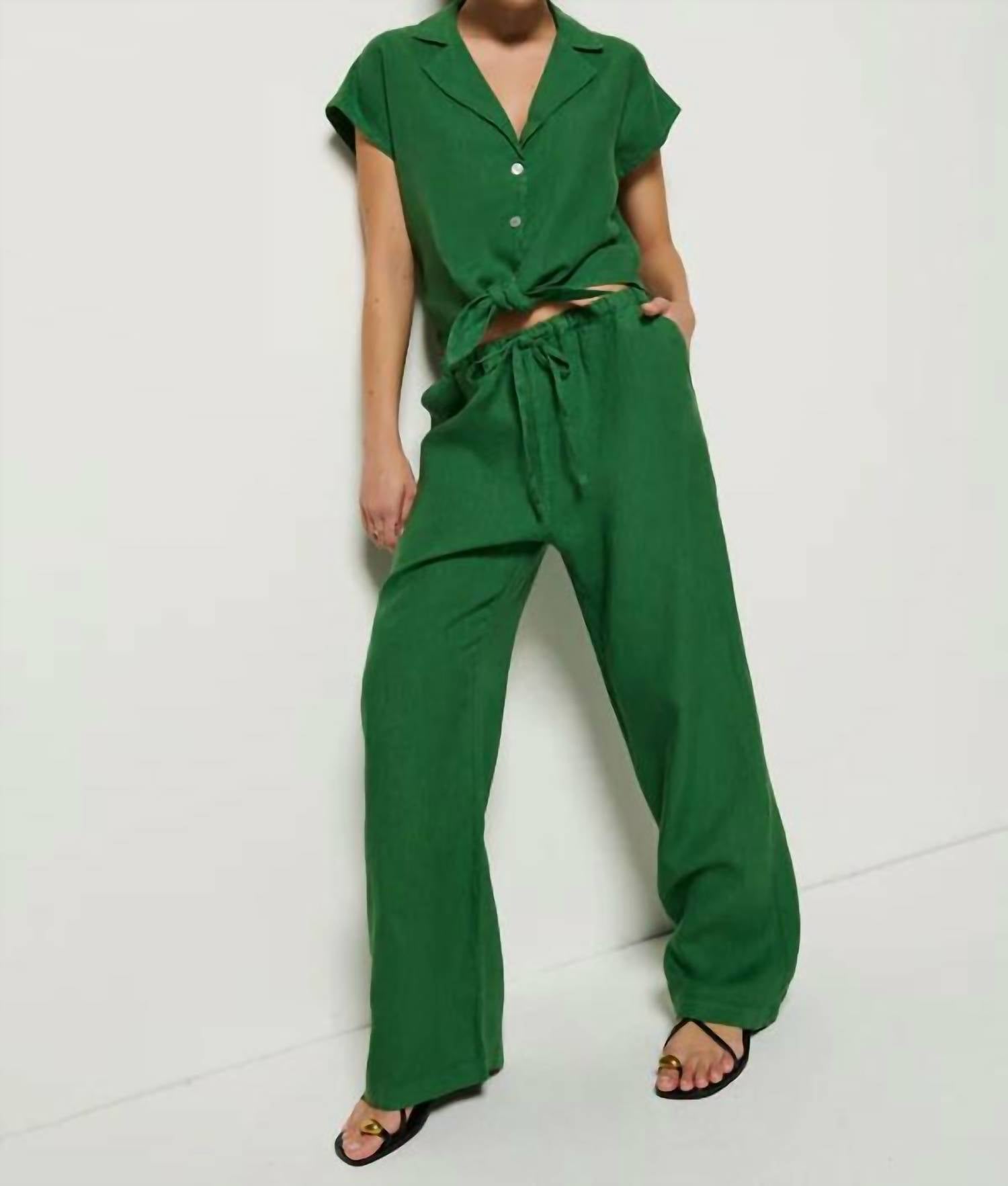 A perfectly tailored straight leg that you'll want in every color! Discover the Lucia Tie Waist Pant by Nation LTD, a chic choice in a lush green, perfect for a relaxed yet refined look. These pants are crafted from 100% authentic premium linen, sourced from European flax, offering lightweight and breathable comfort. Made in Portugal, they feature a tunneled elastic waist with a functional tie, side slit pockets, and back patch pockets. With a straight leg style and easy pull-on closure, they ensure a flattering slim fit while being effortlessly stylish. For care, machine wash, and to prevent any shrinking, air dry or dry on a low setting.