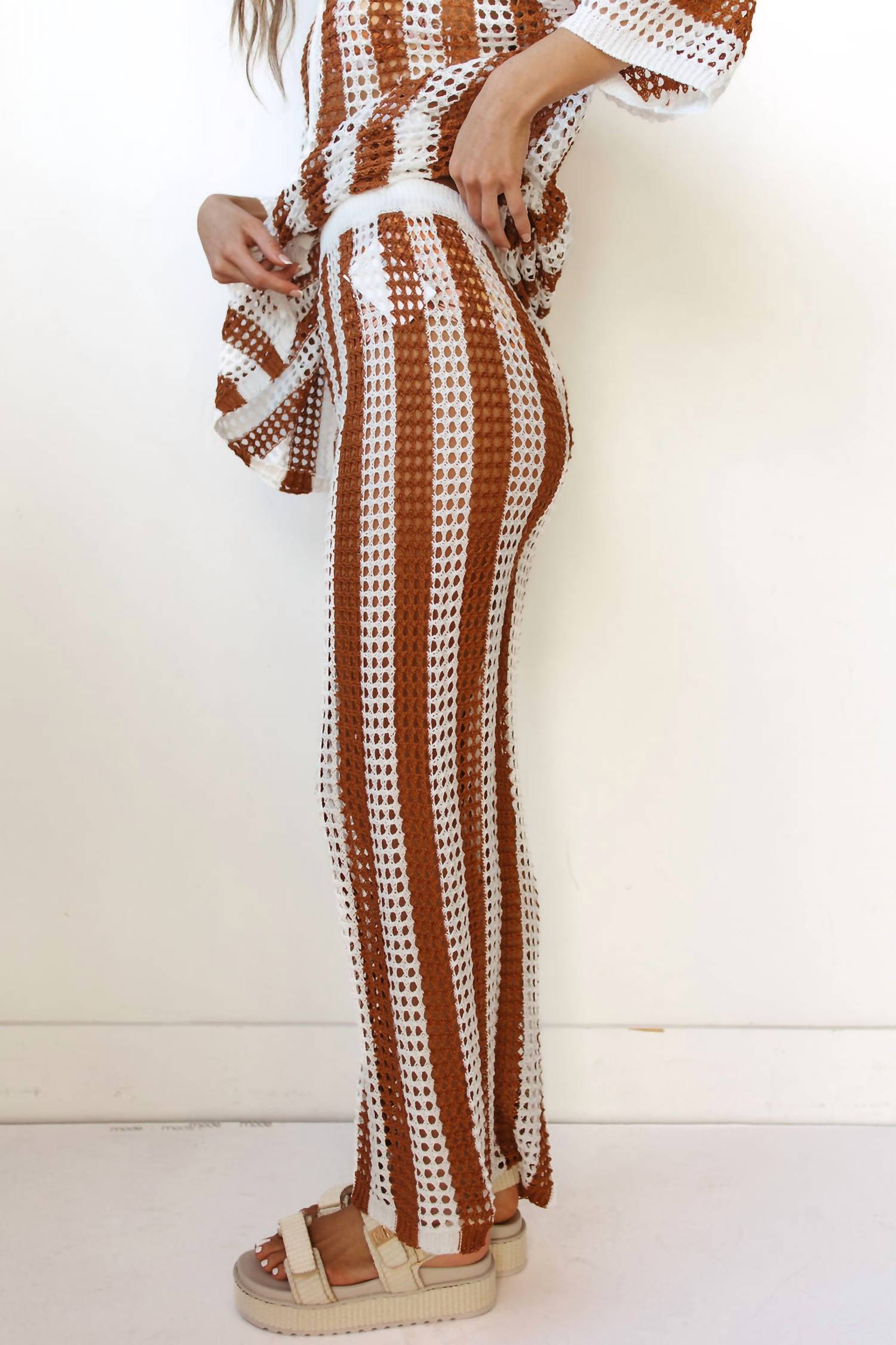 A straightleg pant that workes season after season. Dress these up with your favorite blouse or keep it casual with your go-to tee. Introducing the Coastal Crochet Pants by Little Trendy, designed for a relaxed fit in a chic khaki stripe pattern that embodies Boho Chic style. These straight-leg pants are crafted from comfortable 100% acrylic material and feature a convenient pull-on closure. With a garment length of 41 inches and an inseam of 30.5 inches, they provide an easy and stylish cover-up for your beach day. Care instructions recommend hand washing.
