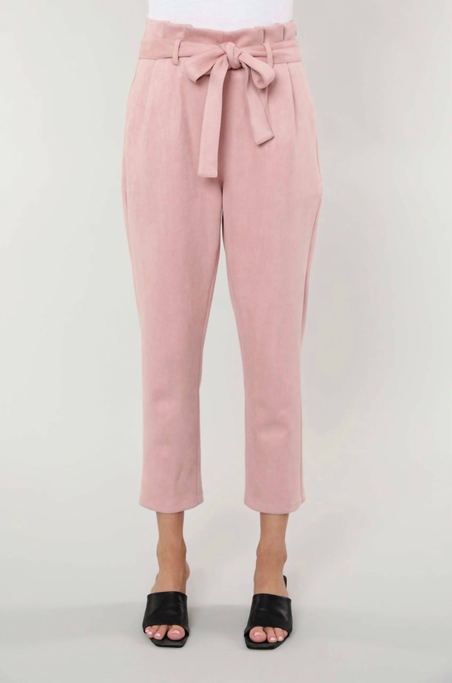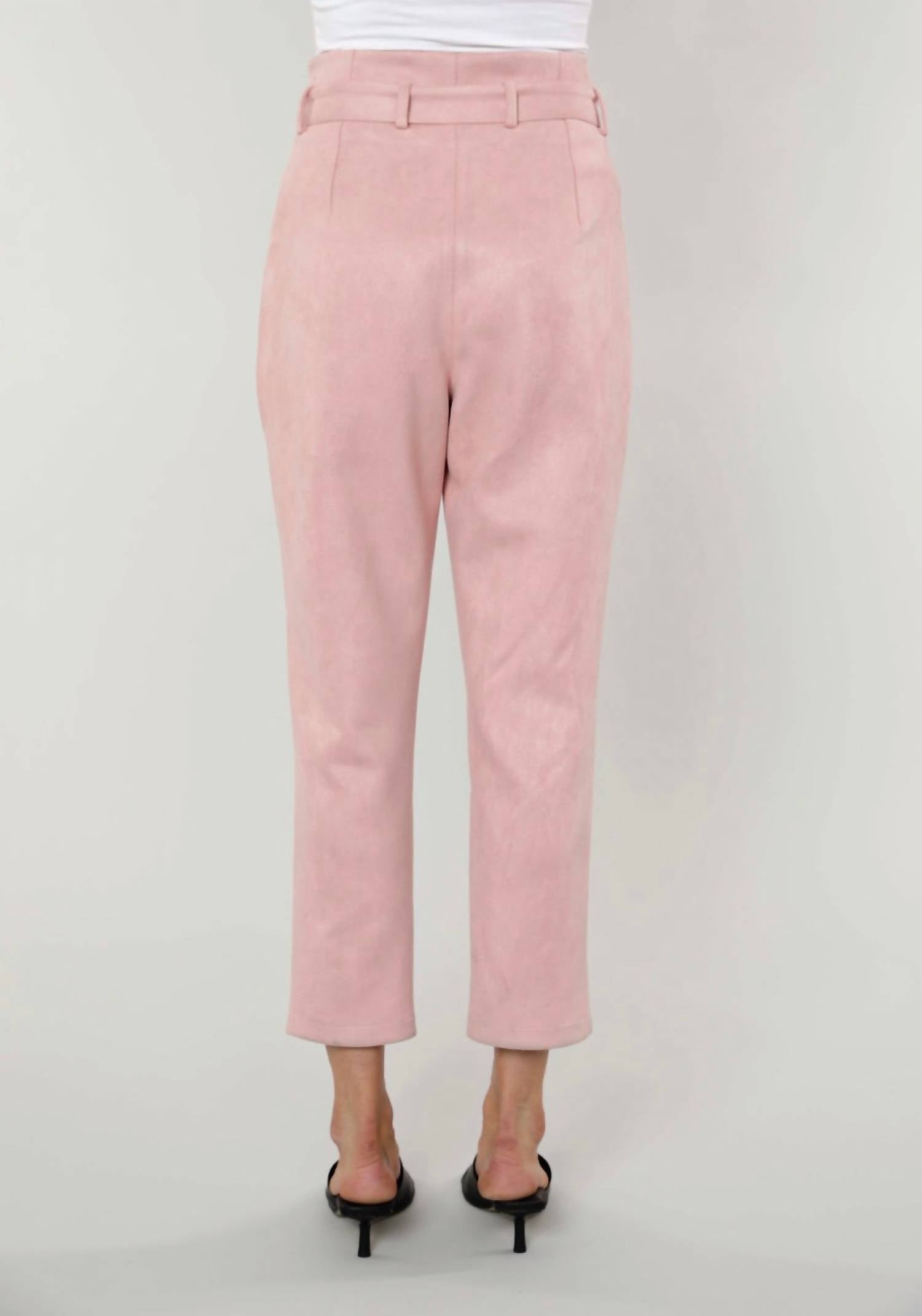 Faux suede. Paper bag waist with tie. Cropped length. True to size. The model is 5 9” and wearing size S. Hand wash cold and line dry or dry clean.