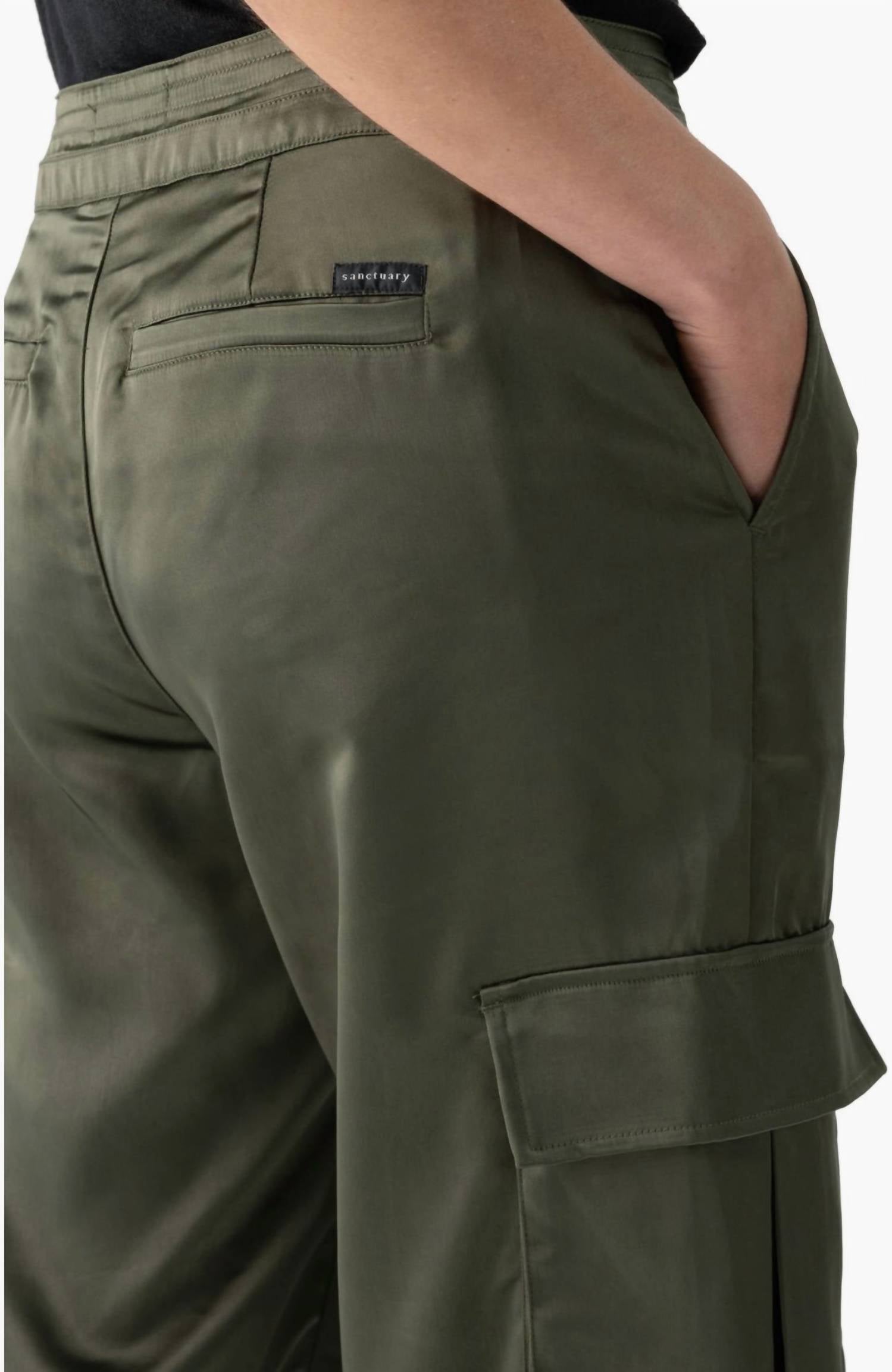 This straightleg pant is both stylish and comfortable. Did we mention the fit is perfection? Explore effortless style with the Eve Cargo Pants by Sanctuary, tailored for both function and fashion. These high-rise pants, crafted from sleek 100% Polyester Satin, feature a full length with a convenient tie closure. Designed with a 31.5" inseam, 11 1/4" front rise, and a 22" leg opening, they offer a flattering straight leg silhouette in a trendy Dark Olive hue. Care for these chic pants by machine washing cold and hanging them to dry, ensuring they remain a versatile staple in your wardrobe.