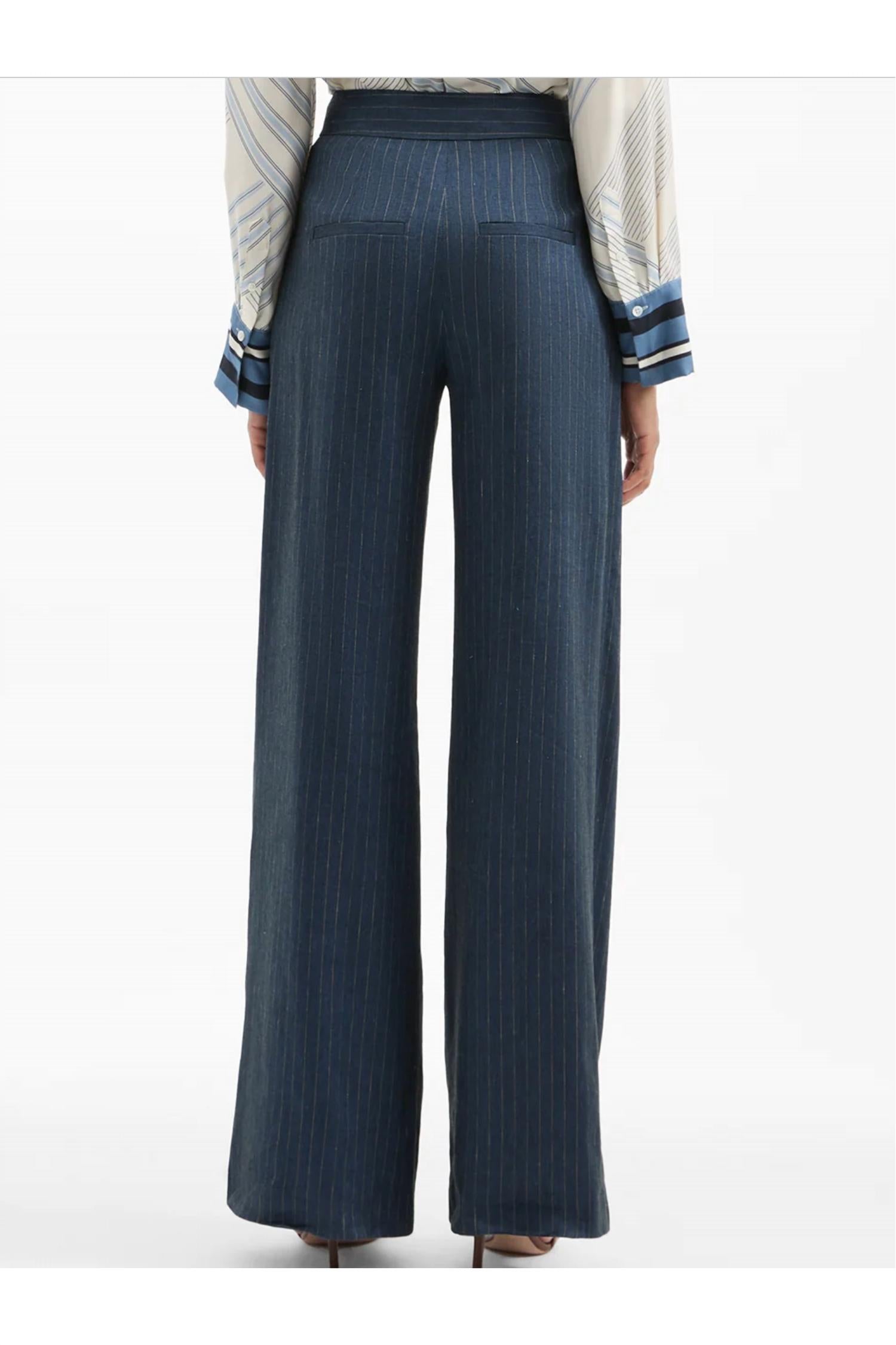 A straightleg pant that workes season after season. Dress these up with your favorite blouse or keep it casual with your go-to tee. Introducing the Rimini Pant by Veronica Beard, a sophisticated choice for any occasion. These trousers showcase a high-waisted, wide-leg fit with side and back pockets, ensuring both style and practicality. Crafted from an exquisite Italian stretch linen blend consisting of 58% Linen, 40% Viscose, and 2% Elastane, these pants promise comfort and elegance with pinstripe detailing. Closure: Side Zipper. Care: Dry clean only. Perfect for pairing with a casual tee or the matching Obie Dickey Jacket for polished ease.