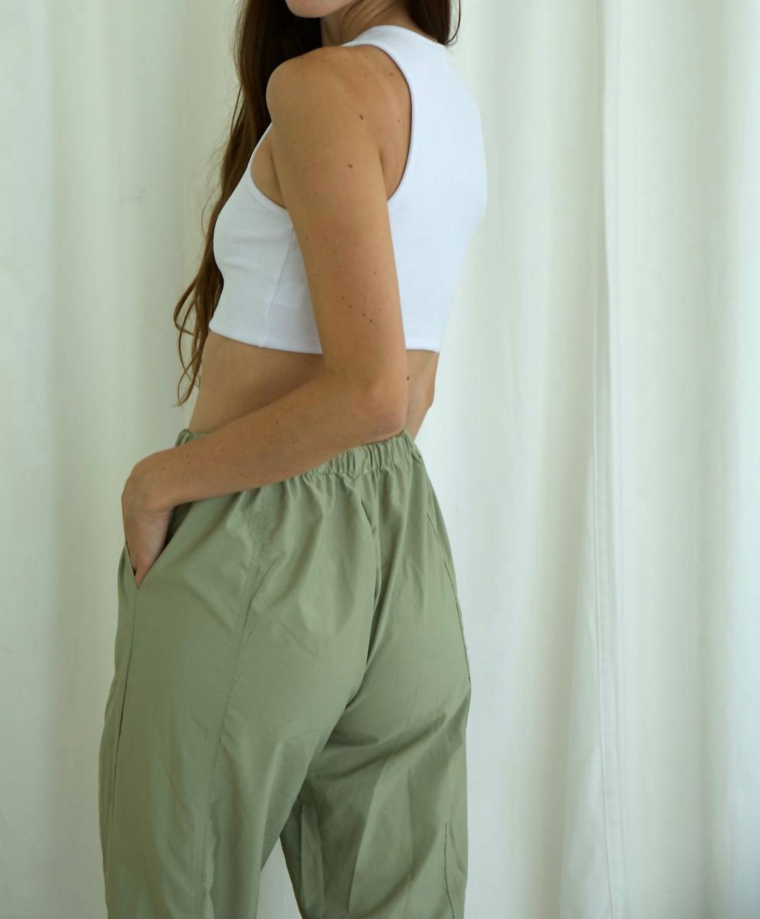 A straightleg pant that workes season after season. Dress these up with your favorite blouse or keep it casual with your go-to tee. Introducing the Luna Parachute Pant by LE LIS, a chic choice for year-round style. Crafted in a light green solid pattern, these pants feature a high rise with a pull-on elastic waist and drawcord for fit ease. Composition: 55% Nylon, 45% Polyester. Closure: Pull-on. Care: Machine wash. Model is 5'8" and wearing a size small. Perfect for the back-to-school season or a casual St. Patrick's Day look, these lightweight pants boast woven stretch, elastic leg openings, and practical pockets, making them a staple in any woman's wardrobe.