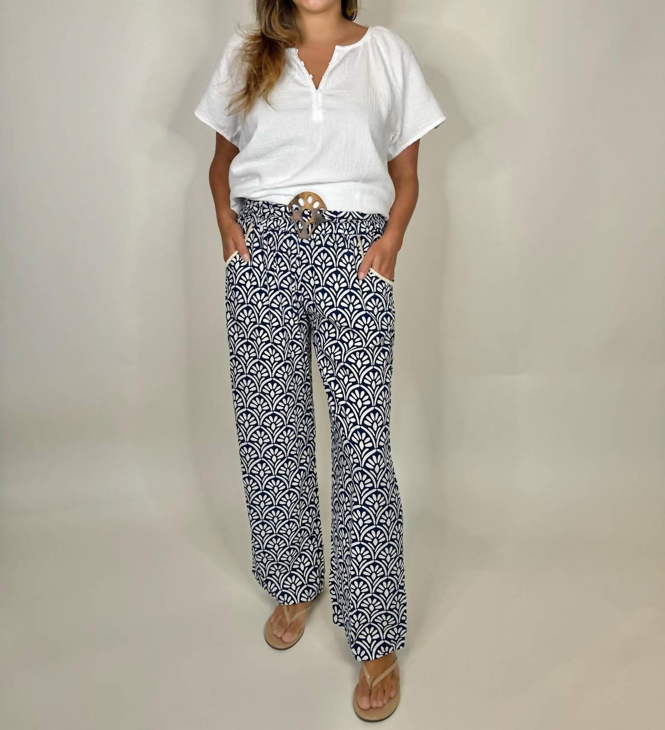 A perfectly tailored straight leg that you'll want in every color! Elevate your style with the SKEMO Art Deco Pants in Navy, offering a chic geometric pattern perfect for a vintage-inspired look. Crafted from 100% Rayon, these straight-leg pants feature convenient pockets and a distinctive wood belt buckle, making them both practical and sophisticated for any occasion. Handmade in Indonesia, these pants feature a pull-on closure for effortless wear and are ideal for travel or celebrating Mother's Day in style. Care for them by hand washing cold, laying flat to dry, and avoid ironing on decorations.