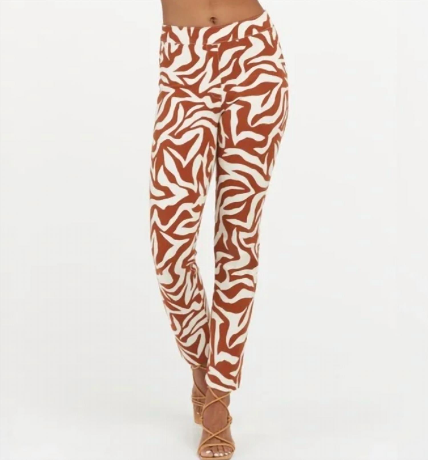 A straightleg pant that workes season after season. Dress these up with your favorite blouse or keep it casual with your go-to tee. Elevate your style with these Spanx On The Go pants! Zebra print, a high-rise design and slimming, stretchy material. 2 side pockets, 2 rear pockets with a flat front design and straight leg.