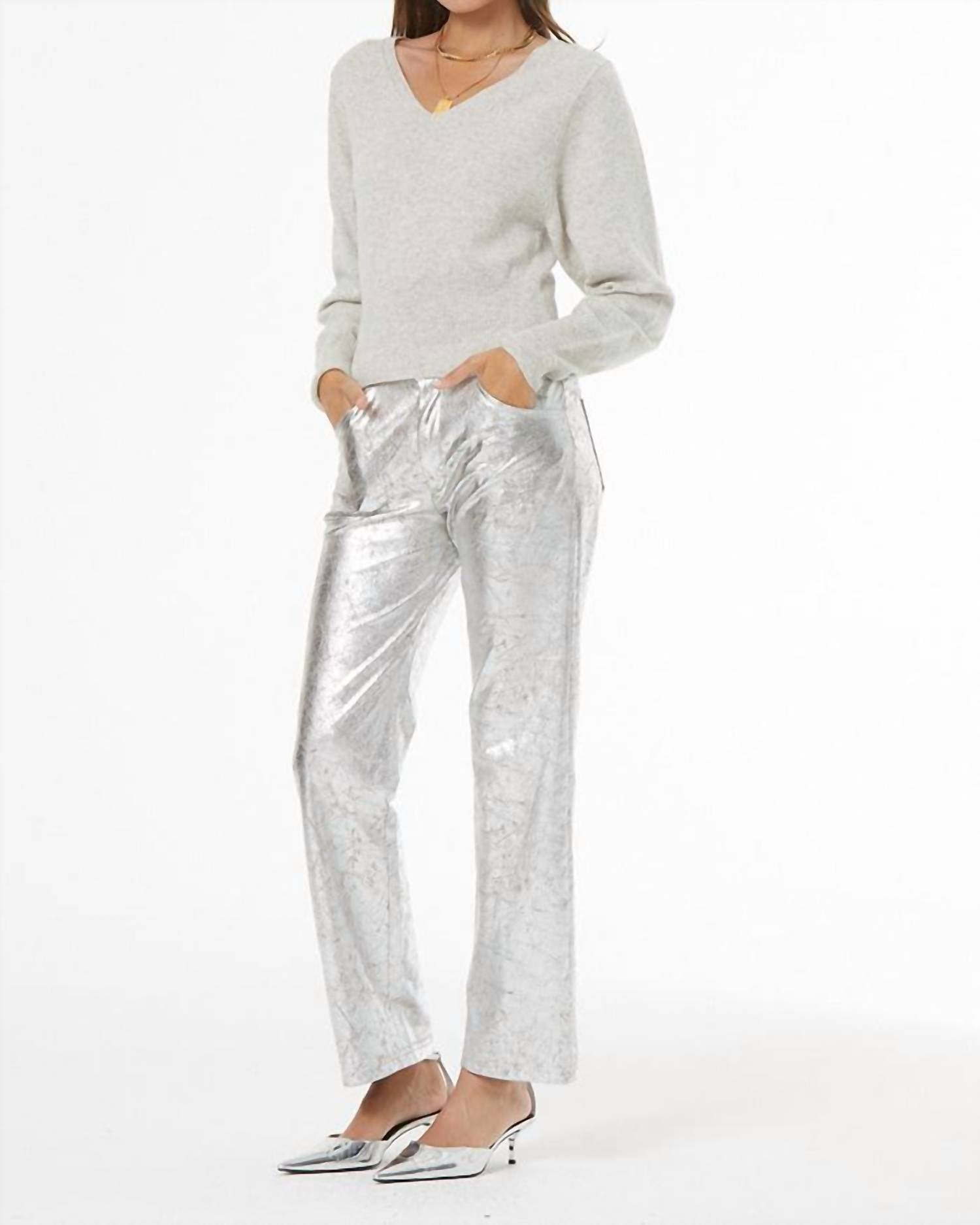 This straightleg pant is both stylish and comfortable. Did we mention the fit is perfection? Discover the Clancy Leather Pant by Young Fabulous & Broke, a chic addition to any wardrobe with its distinctive silver distressed look and textured pattern. Crafted from high-quality Polyurethane, these straight leg pants offer a classic fit and a flattering mid-rise waist. The design features practical pockets and a secure zip closure. Care for these stylish pants with professional dry cleaning.