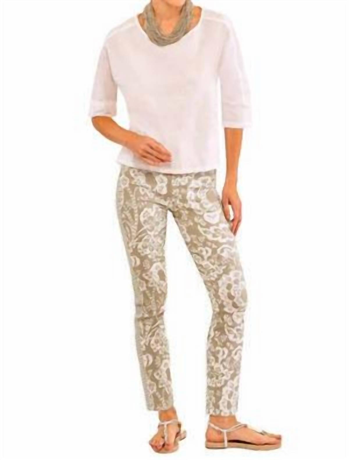 A straightleg pant that workes season after season. Dress these up with your favorite blouse or keep it casual with your go-to tee. Introducing the Flora Khaki Gripeless Pull On Pants by Gretchen Scott, designed for chic versatility with a patterned flair. They feature a high-rise waist with a hidden elasticized band, 2-inch back ankle slits, and 1.5-inch coordinating side band detailing for added style. The pants are composed of 70% Rayon, 25% Nylon, 5% Spandex and highlight a regular fit with a straight leg, available in two lengths: Classic at 27 inches and Tall at 30 inches. Closure is a convenient pull-on style, with care instructions recommending machine wash cold and laying flat to dry for best results.