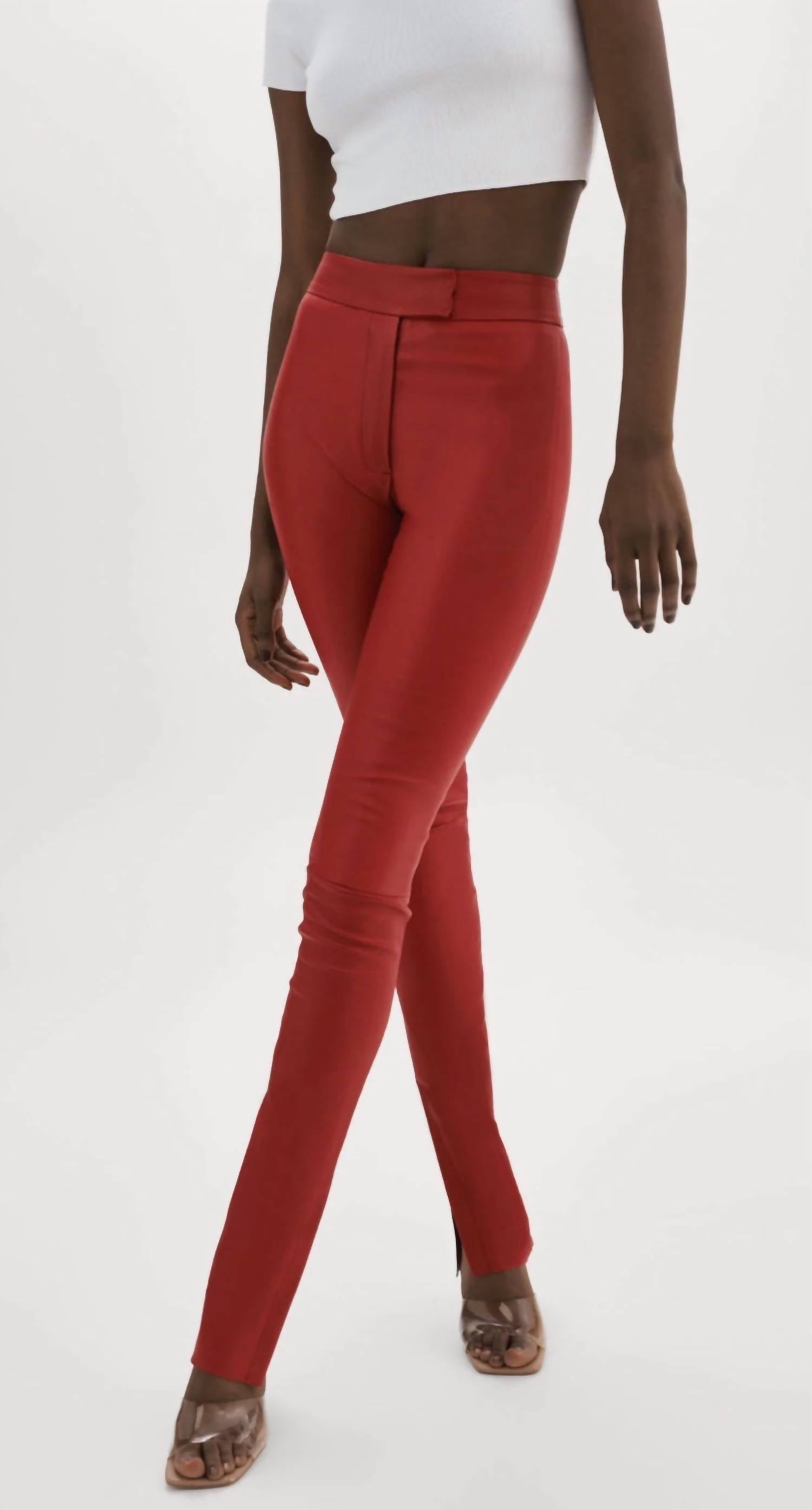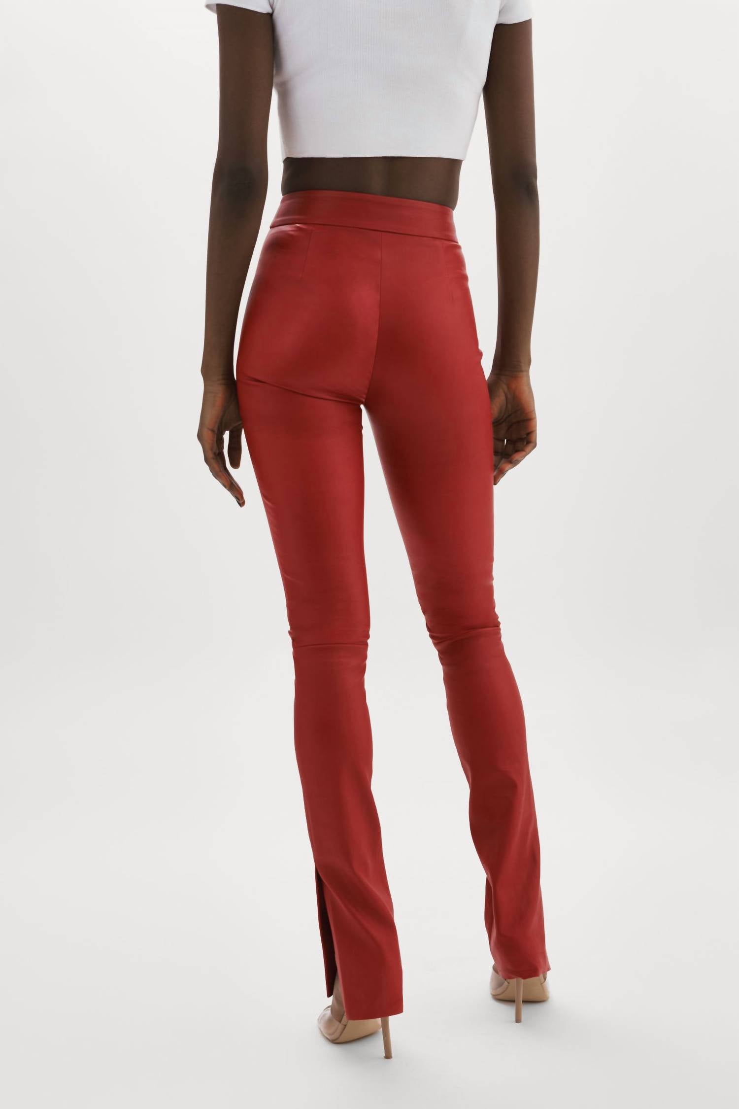 This straightleg pant is both stylish and comfortable. Did we mention the fit is perfection? Introducing the Women's Dawn Stretch Leather Pant by LAMARQUE, crafted for a sleek and edgy style in vibrant Ruby Red. These high-rise pants are made in Canada from 100% Stretch Lamb Leather, offering a second-skin fit with a straight leg and side split hem. With a hook and eye closure, they elevate any ensemble, from casual t-shirts to bodysuits. Care: Spot or wipe clean.