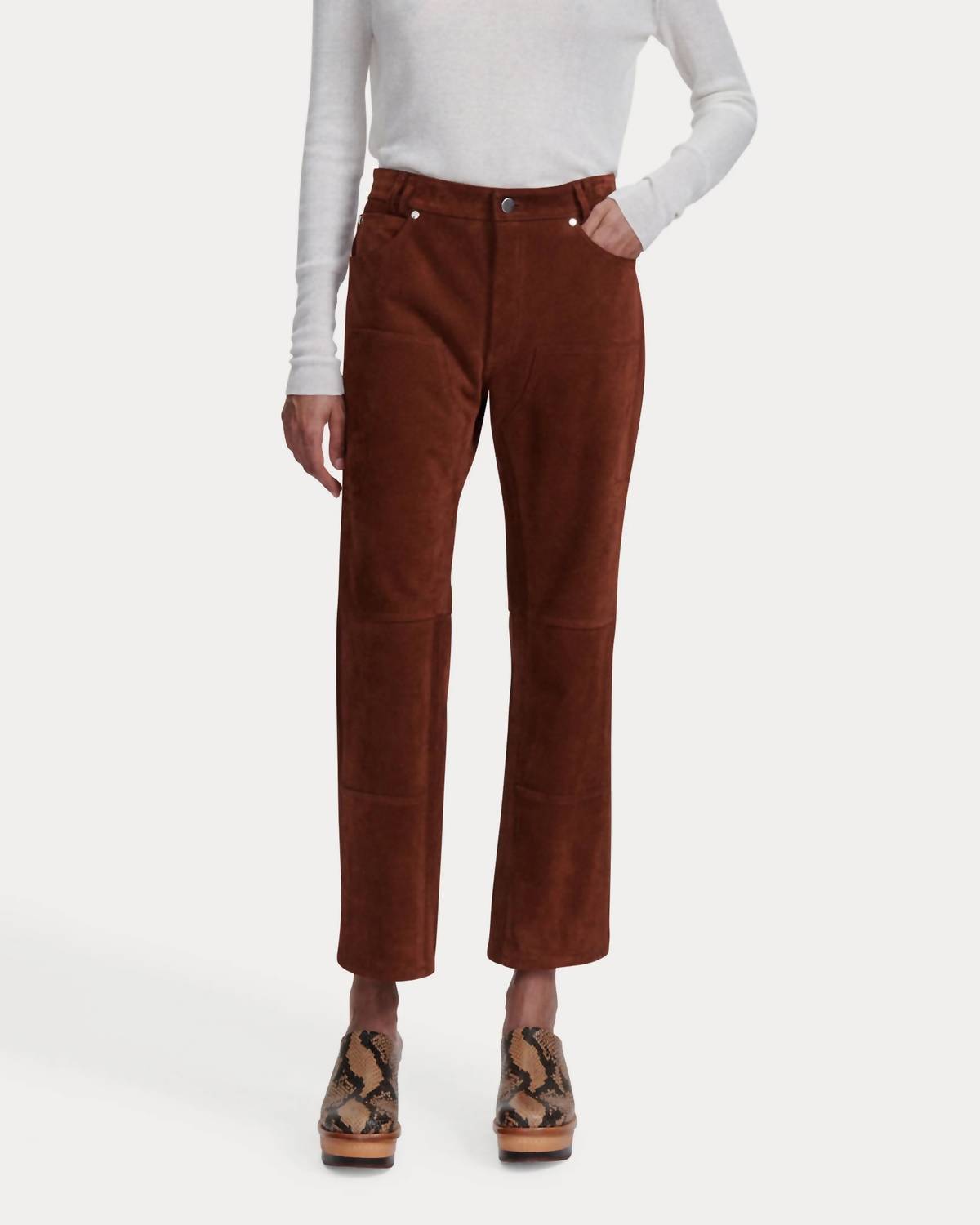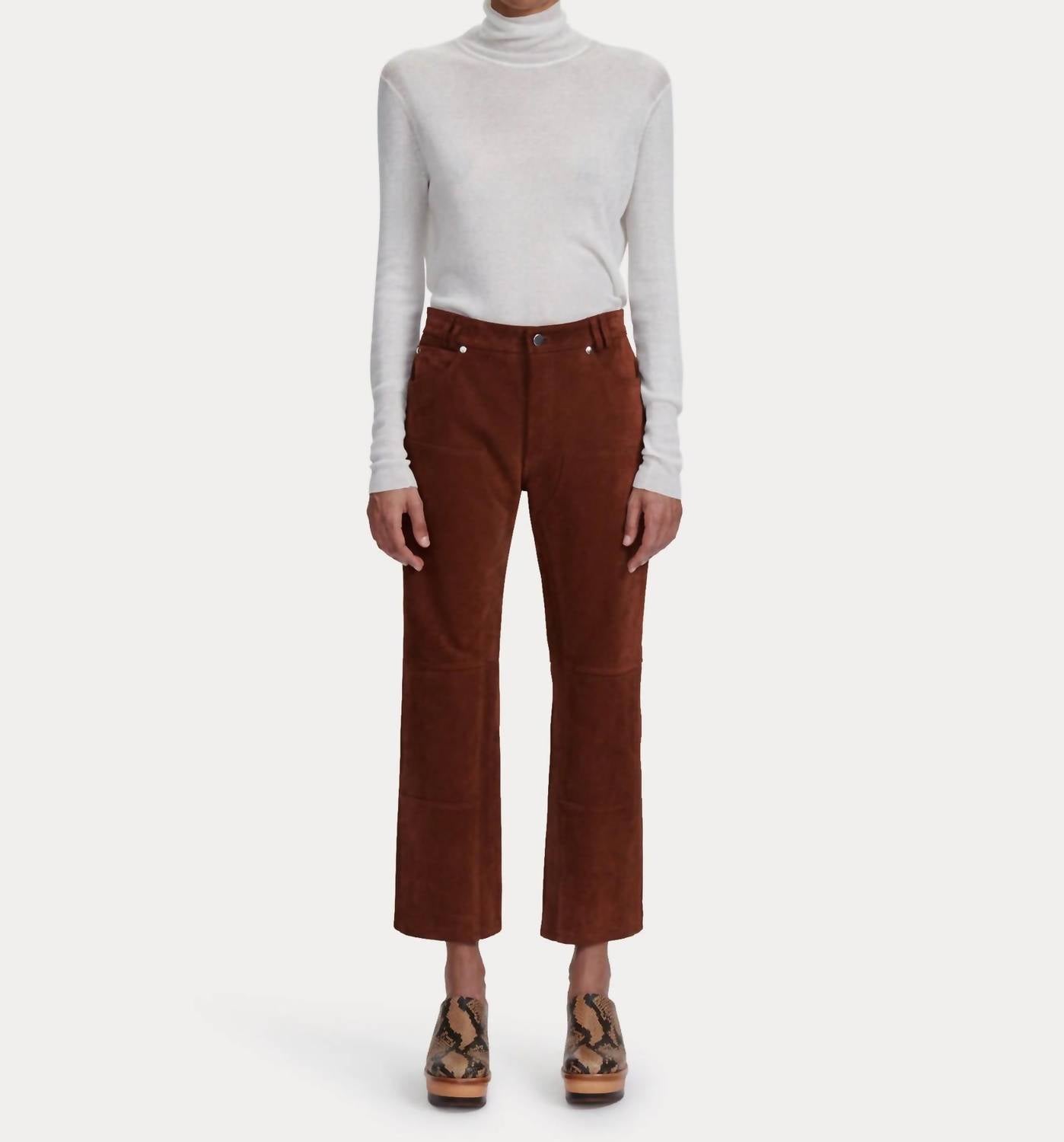 A perfectly tailored straight leg that you'll want in every color! Discover the Normandy Straight-leg Pants by RACHEL COMEY, a fusion of rustic Italian suede and workwear-inspired style. These cropped, mid-rise pants feature straight-leg seamed panels and a practical five-pocket style, promising both durability and luxury in their 100% leather composition. Closure: Zipper and button closure. Made in Turkey, these pants are machine washable and come in a warm chestnut hue, perfect for fall.