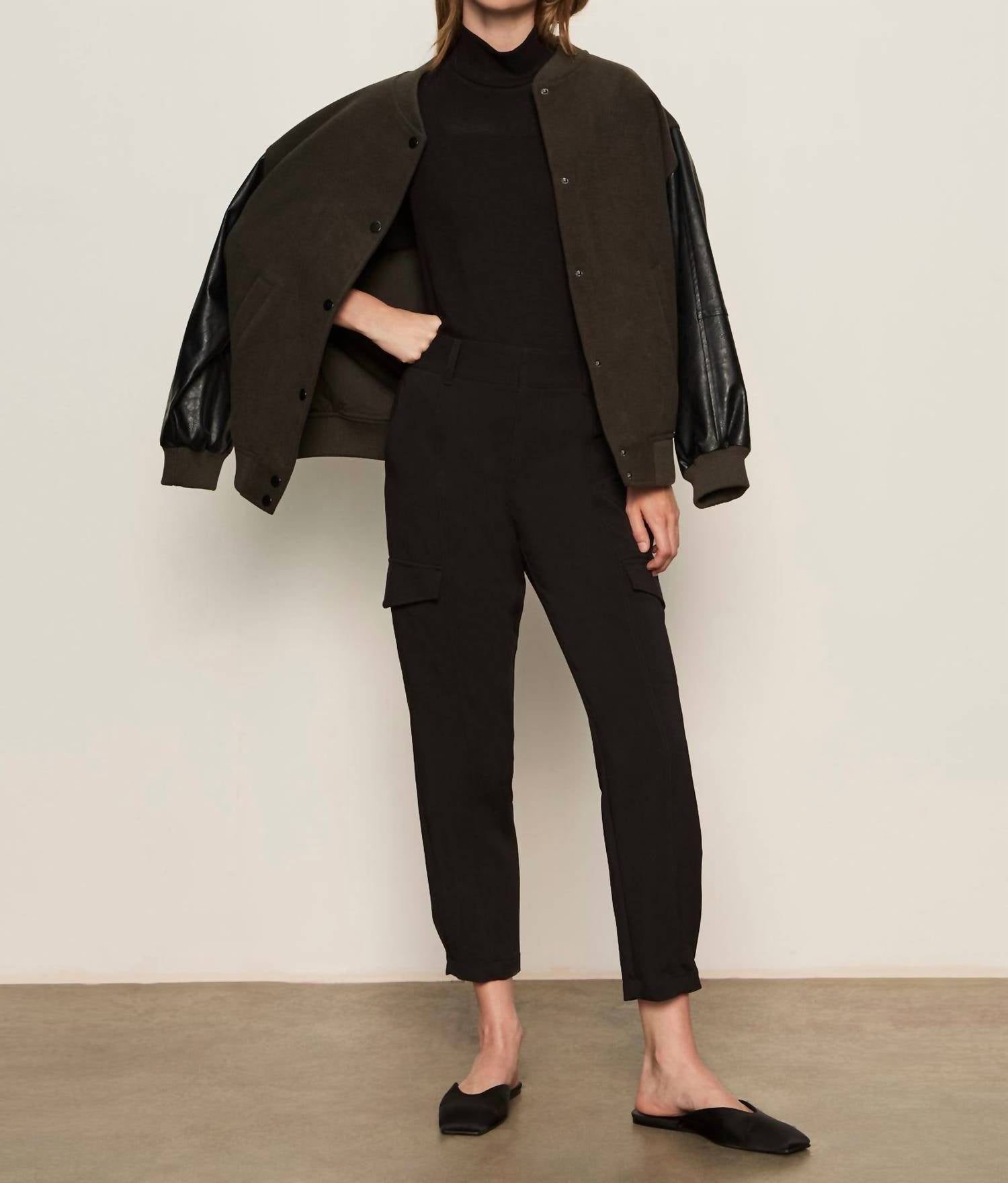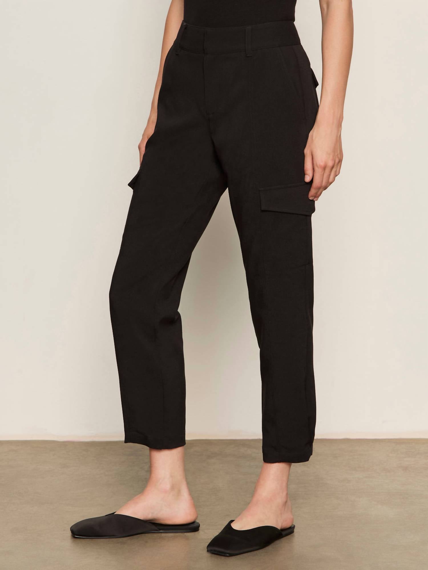 This straightleg pant is both stylish and comfortable. Did we mention the fit is perfection? Meet the Polished Cargo Pant by Sanctuary, a must-have for women seeking style and functionality. Crafted from a blend of 83% Polyester, 15% Viscose, and 2% Elastane, these black pants offer a relaxed fit with standard high rise for everyday comfort. The design features zip and hook-and-bar closure, along with handy 2 front pockets, 2 side cargo pockets, and 2 back pockets to keep essentials close. You can trust their resilience with machine wash care and line dry instructions in mind. Model is 5'9" and wears a size 27, showcasing measurements like a waist of 31", front rise of 10.5", inseam of 27", and a leg opening of 12". Ideal for straight-leg style outdoor adventures.