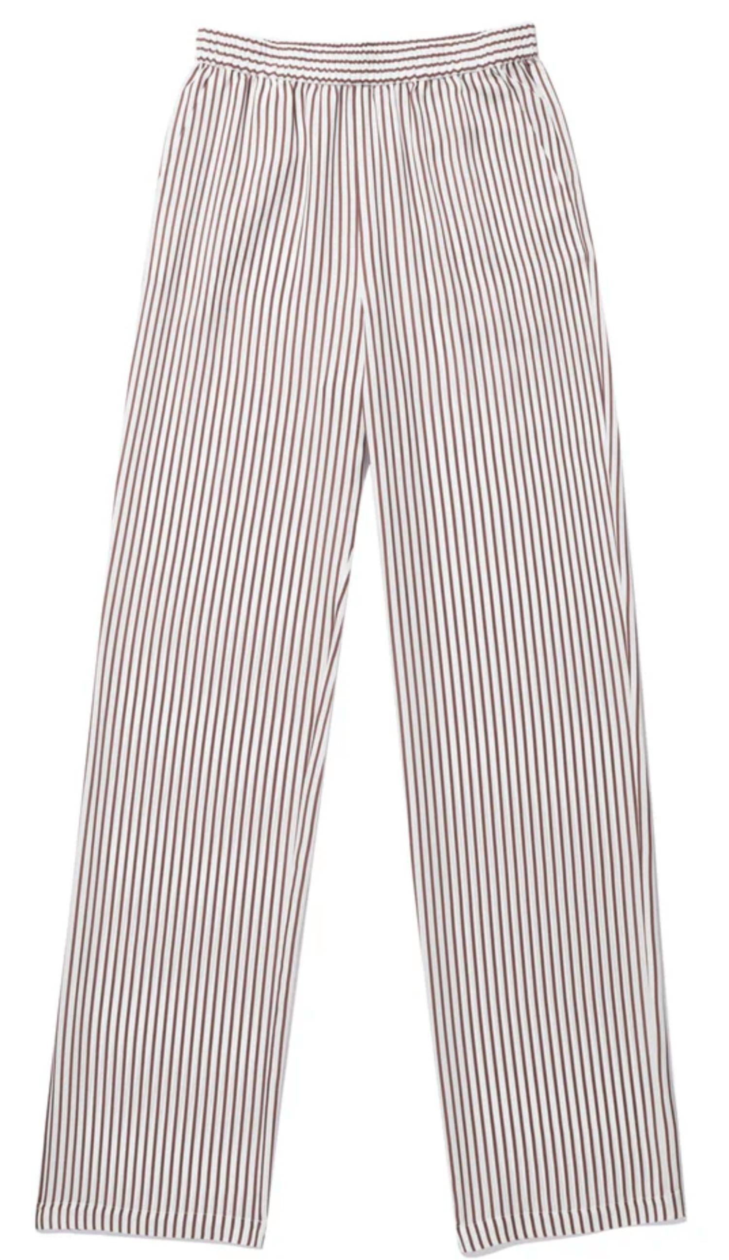 A straightleg pant that workes season after season. Dress these up with your favorite blouse or keep it casual with your go-to tee. Experience effortless elegance with the Women's The Silk Fez Pants by KULE, featuring a chic stripe pattern in white and brown. These full-length straight-leg pants are crafted from 100% silk and boast a comfortable loose fit with a 34" inseam. The pull-on style with an elastic waistband and convenient pockets makes them perfect for relaxed lounging or a stylish dinner out. To maintain their luxurious feel, these pants should be dry cleaned only. Imported.