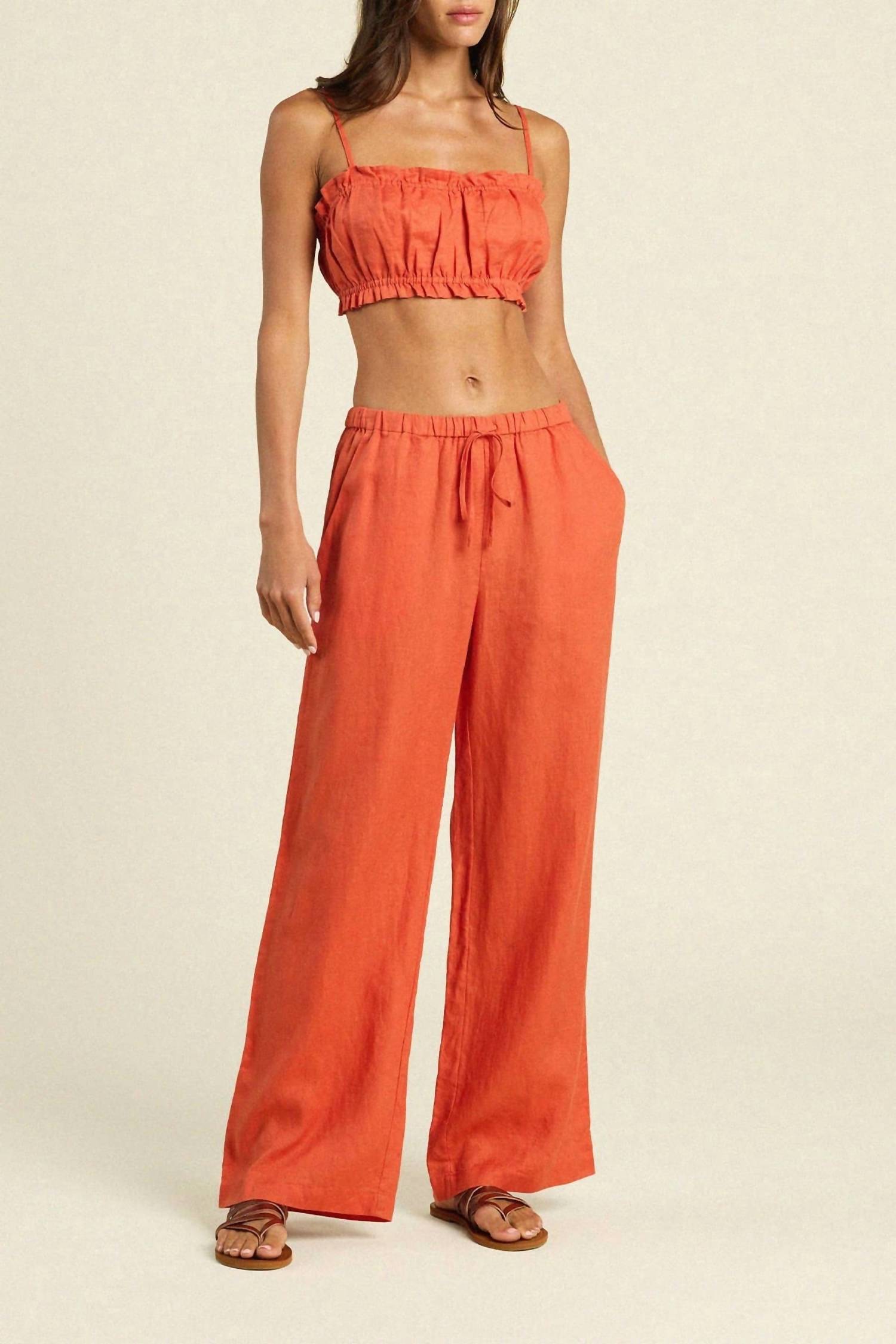 A straightleg pant that workes season after season. Dress these up with your favorite blouse or keep it casual with your go-to tee. Discover the Vera Pant by TROVATA, a stylish full-length pant in a captivating Dried Apricot shade. Crafted from soft linen, these pants feature a flattering straight leg cut and convenient side pockets. The slim drawstring waist casting with elastic ensures a comfortable fit, combined with a versatile tie closure. Care is easy with machine wash and tumble dry instructions, making these pants perfect for effortless dressing up or down.