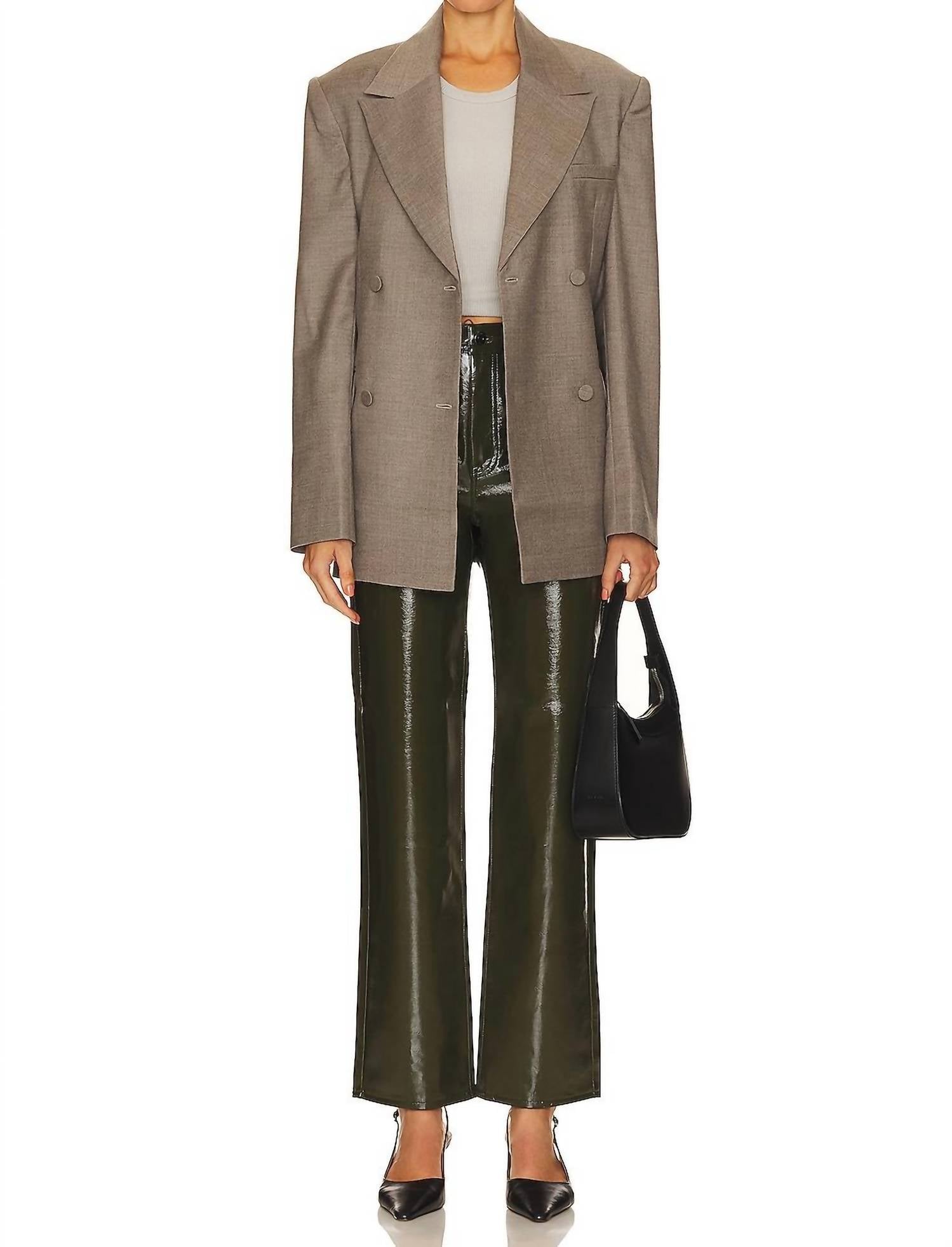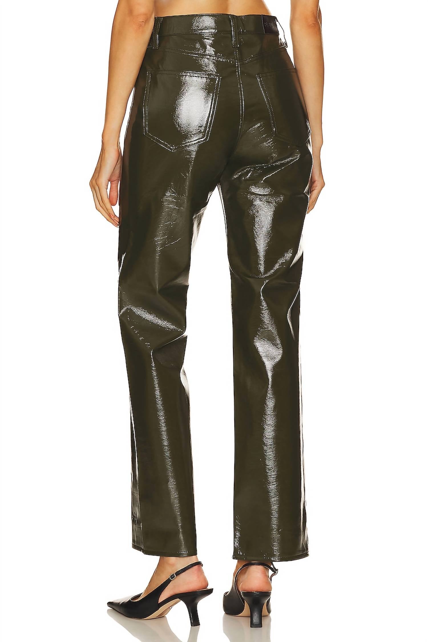 A perfectly tailored straight leg that you'll want in every color! Introducing the Cassie Faux Leather Straight Fit Jeans by PISTOLA, a perfect blend of modern edge and timeless sophistication in Olive Vinyl. These high-rise trousers feature a sleek, straight leg silhouette with a refined 16" knee width and 14" leg opening, making them ideal for professional settings or elegant evenings. Made from 100% polyurethane and designed with 5-pocket styling, they offer both style and practicality. Closure: Zip fly with button closure. Care: Machine wash. Made in China, these pants exemplify the trend of Quiet Luxury, perfect for Fall and New Year's Eve dinners.