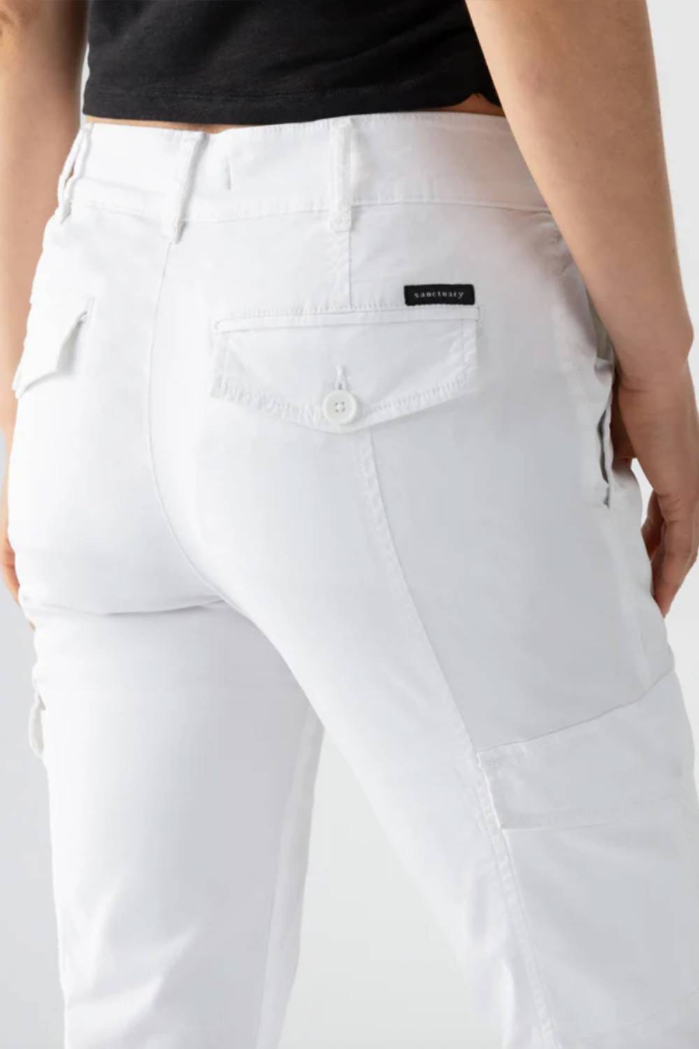 A perfectly tailored straight leg that you'll want in every color! Embrace casual elegance with the Women's Rebel Pant by Sanctuary. Crafted from a breathable cotton blend, these solid white cargo pants offer a standard rise and relaxed fit, featuring an elastic hem and multiple pockets for practicality. The pants have a double button and zipper closure, with hidden snap closures on the back pockets for an added touch of style. Made with Sanctuary's sustainability practices, they are easy to care for—machine wash warm and line dry. Model measurements: 5'9", wears size 27 (waist 30.5", front rise 10", inseam 27", leg opening 11").