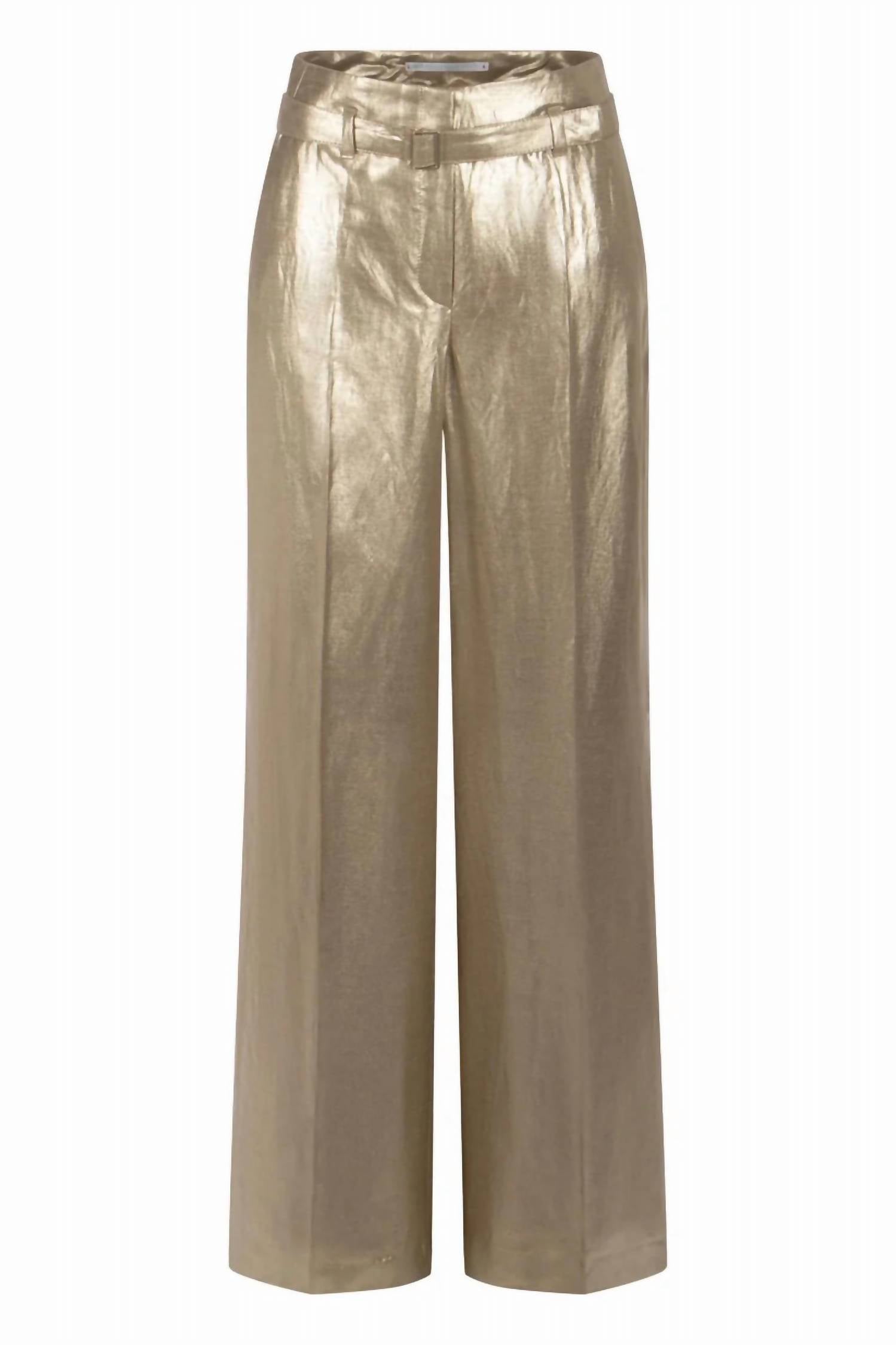 Anais pants with high waist design, belt accent, and flowing wide-leg cut. Crafted from a fabric with a subtle sheen.