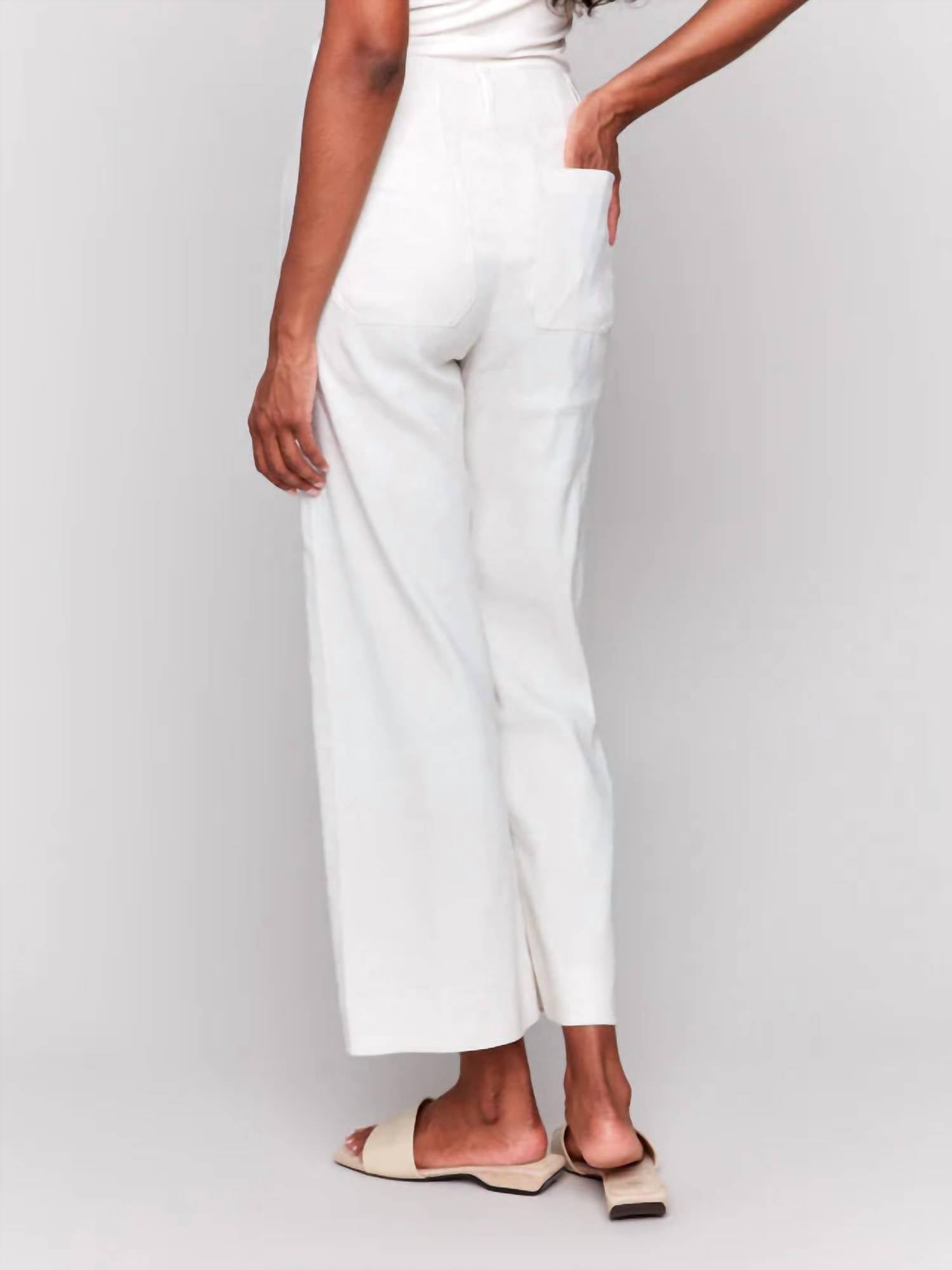 A perfectly tailored straight leg that you'll want in every color! Introducing the Patch Pocket Pants by CHARLIE B, a sophisticated choice in natural white for a modern look. Designed for women, these straight-leg pants feature a classic fit with fashionable patch pockets for added style. Made from a luxurious linen blend, they offer light texture and a flattering silhouette, perfect for spring and summer occasions. Closure is with a button, and for care, machine wash and lay flat to dry.