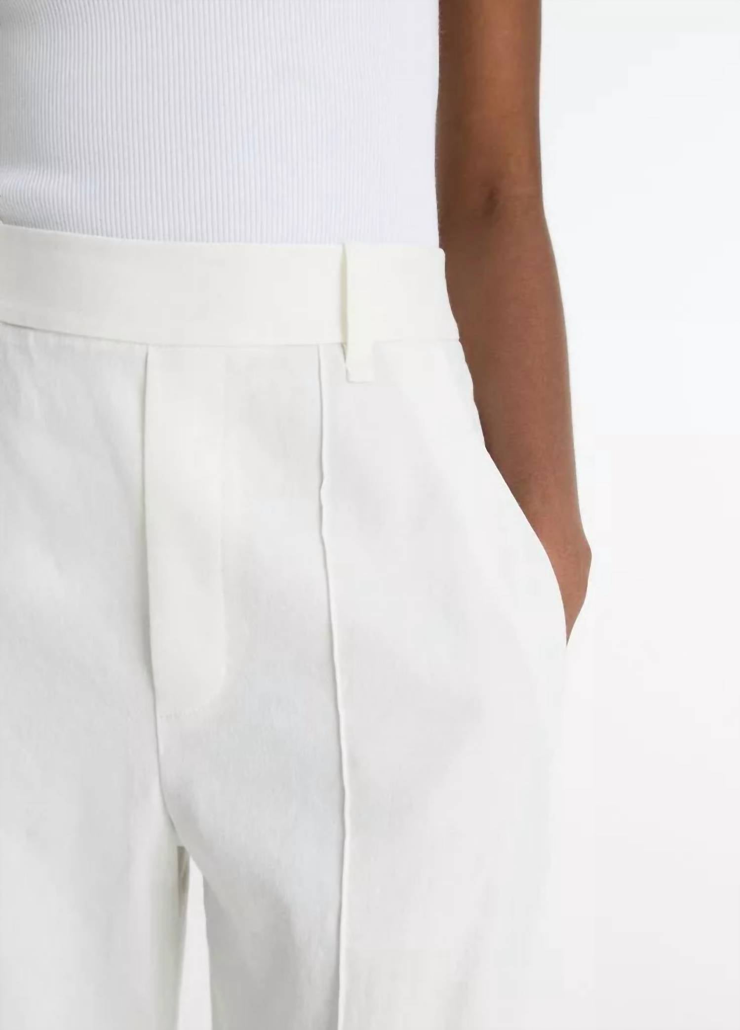 A straightleg pant that workes season after season. Dress these up with your favorite blouse or keep it casual with your go-to tee. Discover the Vince Women's Linen Blend High Rise Pull On Pant in elegant Off White, a stylish and comfortable option for your wardrobe. With a relaxed straight leg and a high-rise waist, these pants offer a sophisticated look with discreet comfort thanks to an elasticized back. Composed of 64% linen, 34% rayon, and 2% spandex, they feature a convenient pull-on closure and multiple functional pockets. The pants boast a 32.5" inseam and require hand washing, with line drying advised for maintenance. Tailored in a solid pattern, they are a perfect choice for a chic dinner party or to embrace the season's Western trend. Model wears a size S (5'10" height, 32" bust, 24" waist, 35" hips).