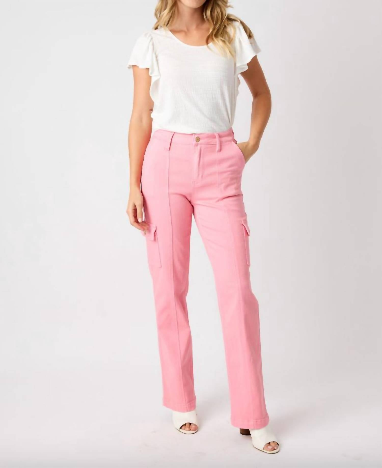 This straightleg pant is both stylish and comfortable. Did we mention the fit is perfection? Elevate your wardrobe with the Judy Blue Straight Leg Cargo Jeans, an effortlessly chic piece in a trendy pink hue. Crafted from a blend of 93% Cotton, 6% Polyester, and 1% Spandex, these jeans combine comfort and style with a high-rise fit of 12 inches and a 32-inch inseam. The straight leg silhouette features a convenient zip closure and handy pockets, ideal for everyday wear. A versatile addition to your collection, perfect for any occasion.