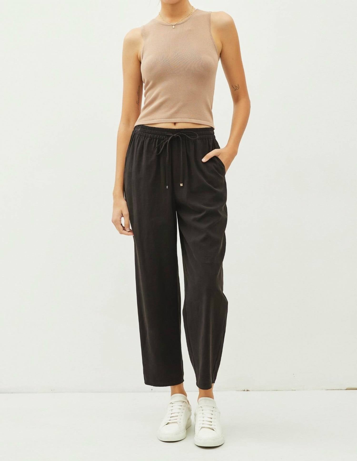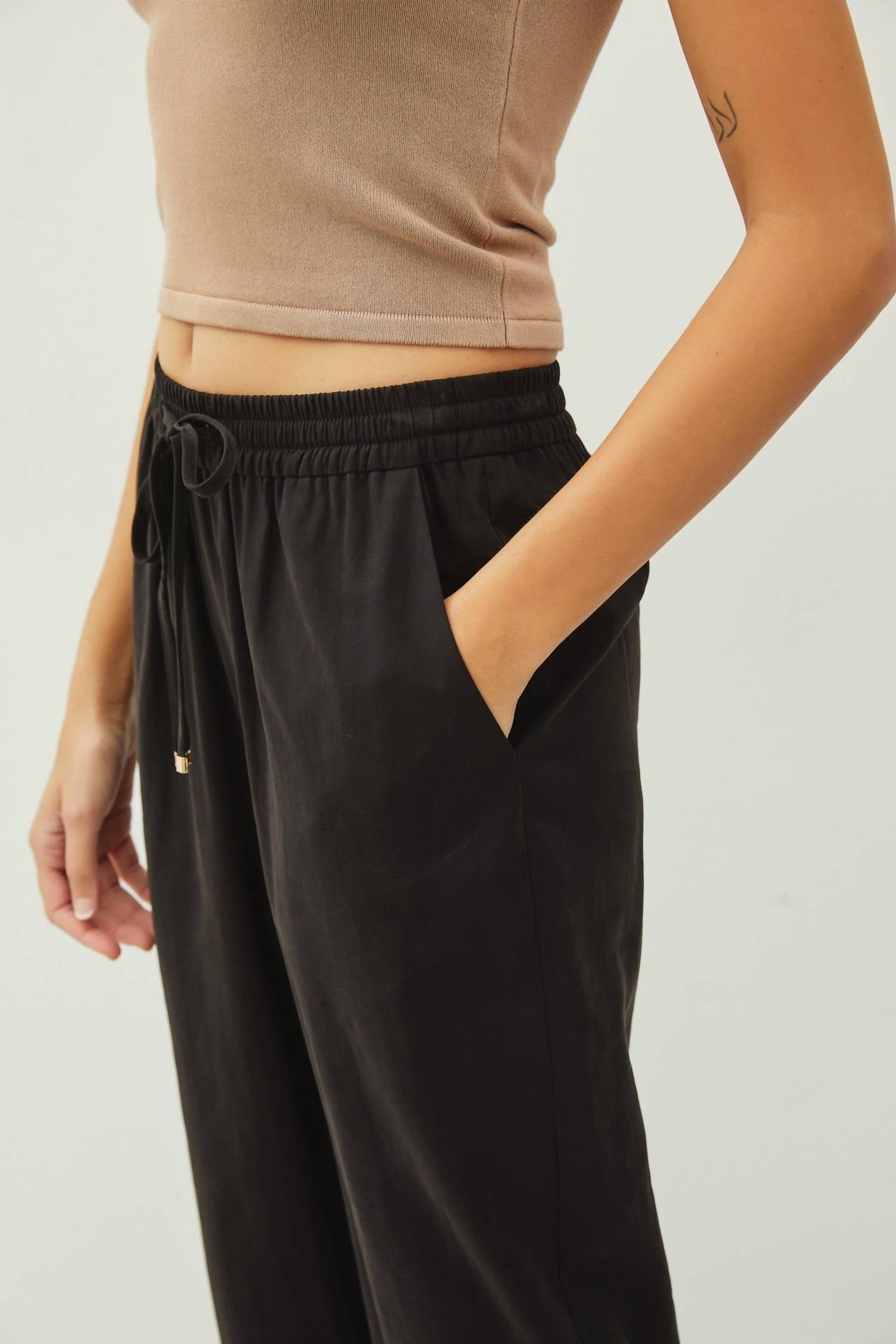 This straightleg pant is both stylish and comfortable. Did we mention the fit is perfection? Embrace comfort and effortless style with the Weekend Drift Ankle Pant by Be Cool. These black pants are crafted from a soft blend of 88% Rayon and 12% Polyester, offering a relaxed fit and high-rise design that combines snug comfort with elevated streetwear aesthetics. Featuring a pull-on, elastic drawstring waistband, these straight-leg pants are designed with functional pockets and a cropped ankle length, perfect for pairing with sneakers or sandals. Easy to care for, simply machine wash for hassle-free maintenance, making them an ideal choice for casual outings or relaxed weekends.