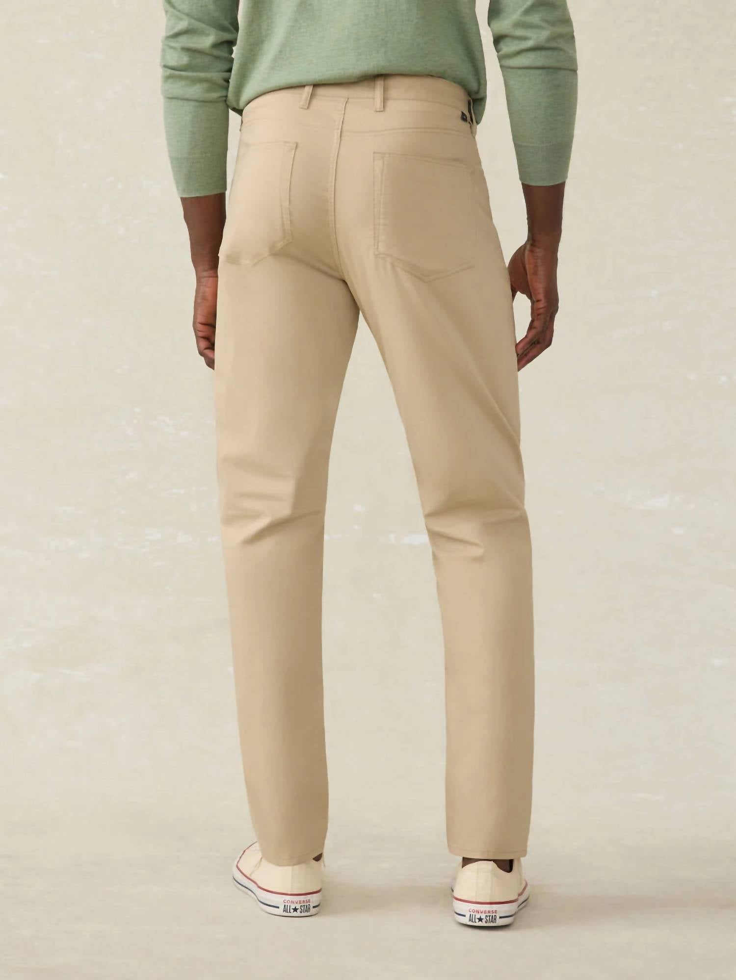 A perfectly tailored straight leg that you'll want in every color! Discover the Faherty 5 Pocket Movement Pants, crafted for both style and utility in a comfortable pull-on design. Perfect for travel, these men's pants are made from a blend of 63% organic cotton, 33% COOLMAX EcoMade polyester, and 4% elastane, ensuring a regular, straight-leg fit. They feature a mid-rise with a five-pocket layout, including a hidden zip pocket, all in a solid Island West Khaki hue. Care: Machine wash cold with like colors on a delicate cycle, tumble dry low, and warm iron if needed.