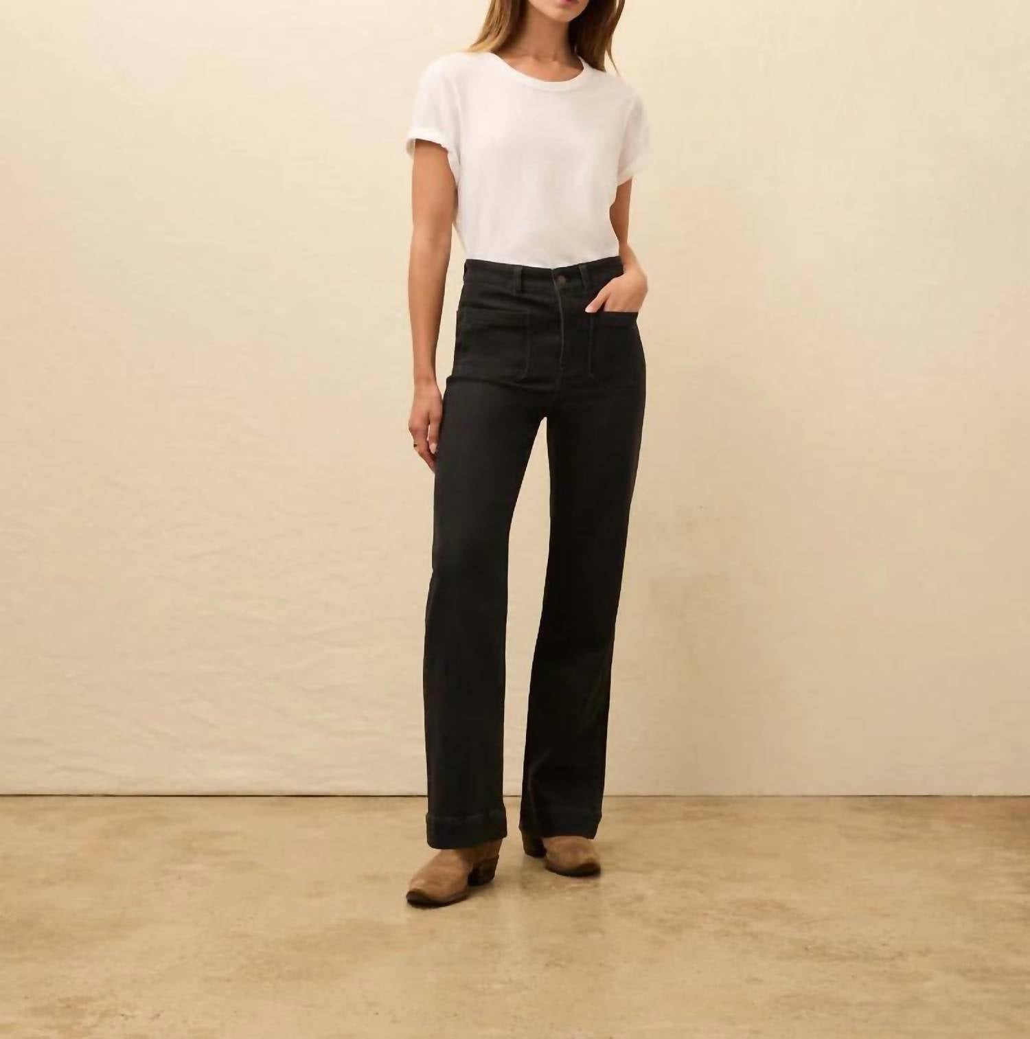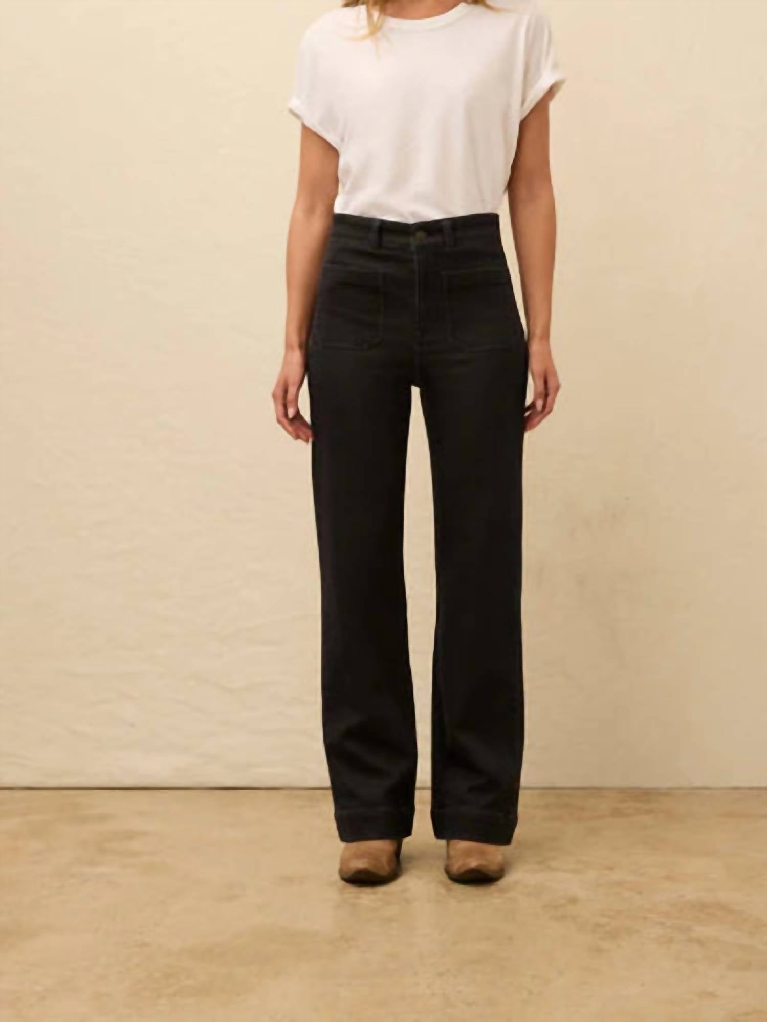 A perfectly tailored straight leg that you'll want in every color! Discover the Stretch Terry Patch Pocket Straight Pants by Faherty, a nod to 70s style with a high-waist and a wide-leg silhouette perfect for everyday wear. These pants are crafted from a blend of 83% Regenerative Cotton, 16% Recycled Polyester, and 1% Spandex, offering the comfort of lounge wear and the softness of denim. They feature a fitted design with a 32" inseam and are equipped with patched front and back pockets. Care is a breeze—simply machine wash cold, tumble dry low, and use a warm iron if needed. Juliette is 5'9" and wears size 25.
