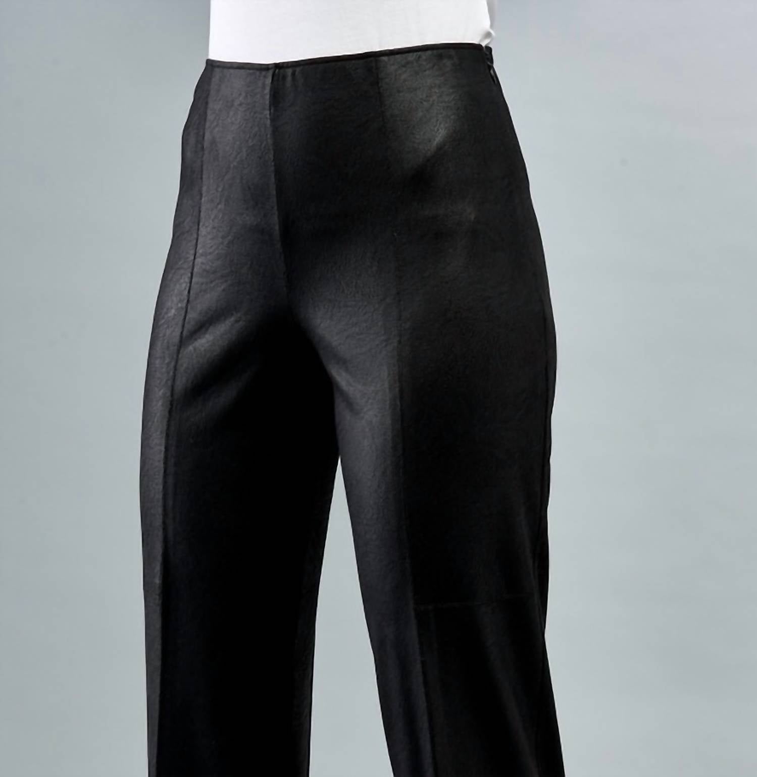 A perfectly tailored straight leg that you'll want in every color! Elevate your evening ensemble with the Solid Vegan Pant by Insight, a chic addition for workwear or New Year's Eve celebrations. Featuring a sleek straight leg and a slim fit, these high-rise pants in classic black offer a contemporary style perfect for fall. Crafted from faux leather, they come without pockets and secure with a side zipper. Ideal for a sophisticated evening look.