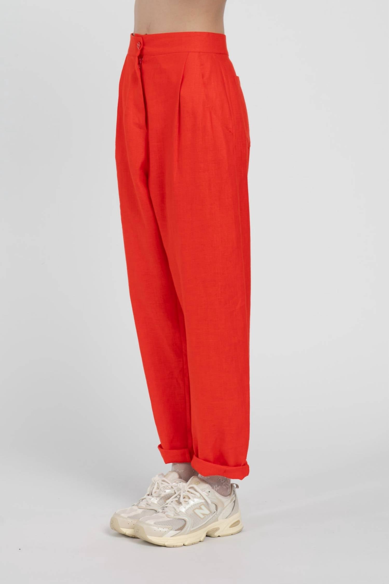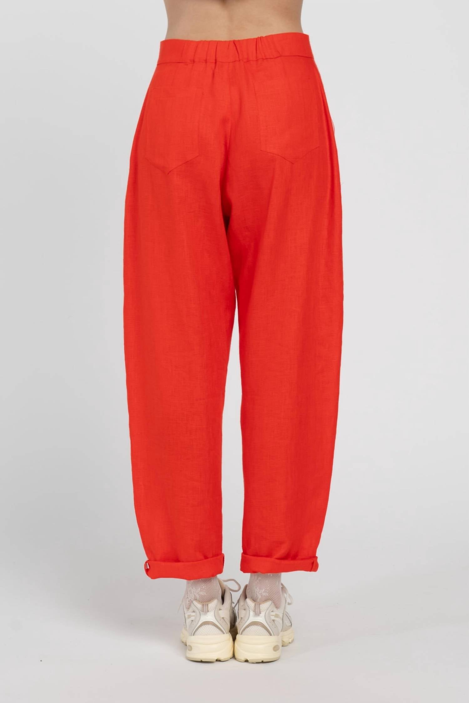 This straightleg pant is both stylish and comfortable. Did we mention the fit is perfection? Elevate your summer wardrobe with the Giovanni High Waist Pants by LĀU, a standout in vibrant red. Crafted entirely from linen and made in Italy, these pants feature a wide leg that tapers towards the bottom, offering a comfy fit with a high-rise design. The button closure ensures a secure fit, complemented by oblique front pockets for added style. Easy to maintain, these pants can be machine washed and tumble dried, making them a perfect choice for holiday parties or embracing the Scandi Style trend.