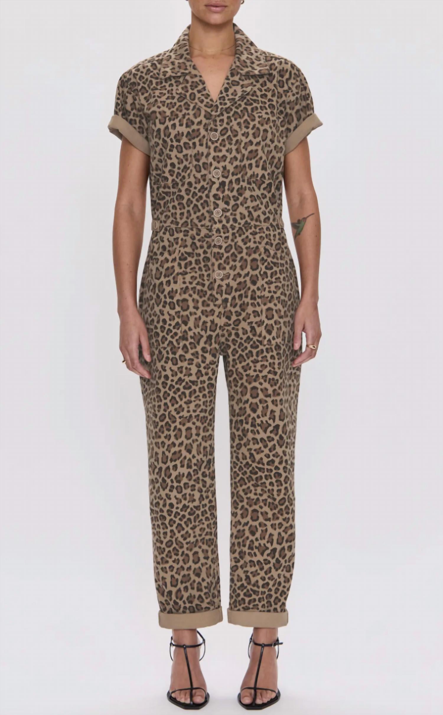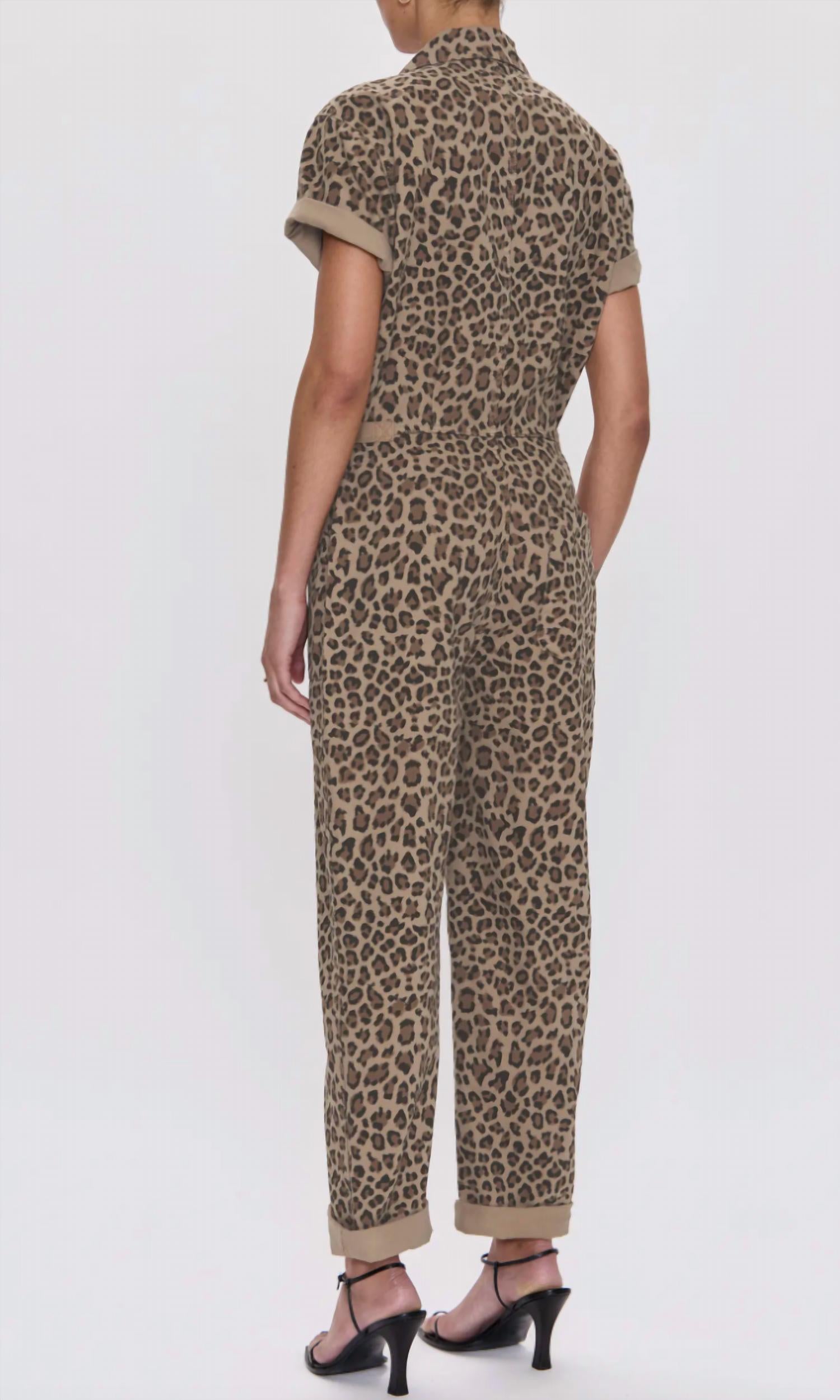 This straightleg pant is both stylish and comfortable. Did we mention the fit is perfection? Introducing the Grover Cotton Jumpsuit by PISTOLA, a utilitarian-inspired piece in a chic feline color that embodies quiet luxury. This jumpsuit features short sleeves, multiple pocket styles including chest patch and back patch pockets, and a front slant pocket for added convenience. Crafted from 100% cotton, it showcases a classic fit with a tapered leg and 28" inseam. Closure is secured with a front button closure, with a notched collar elevating its design. The total garment length is 57.5" for size Medium. Ideal for spring holiday parties, it's recommended to dry clean for optimal care.