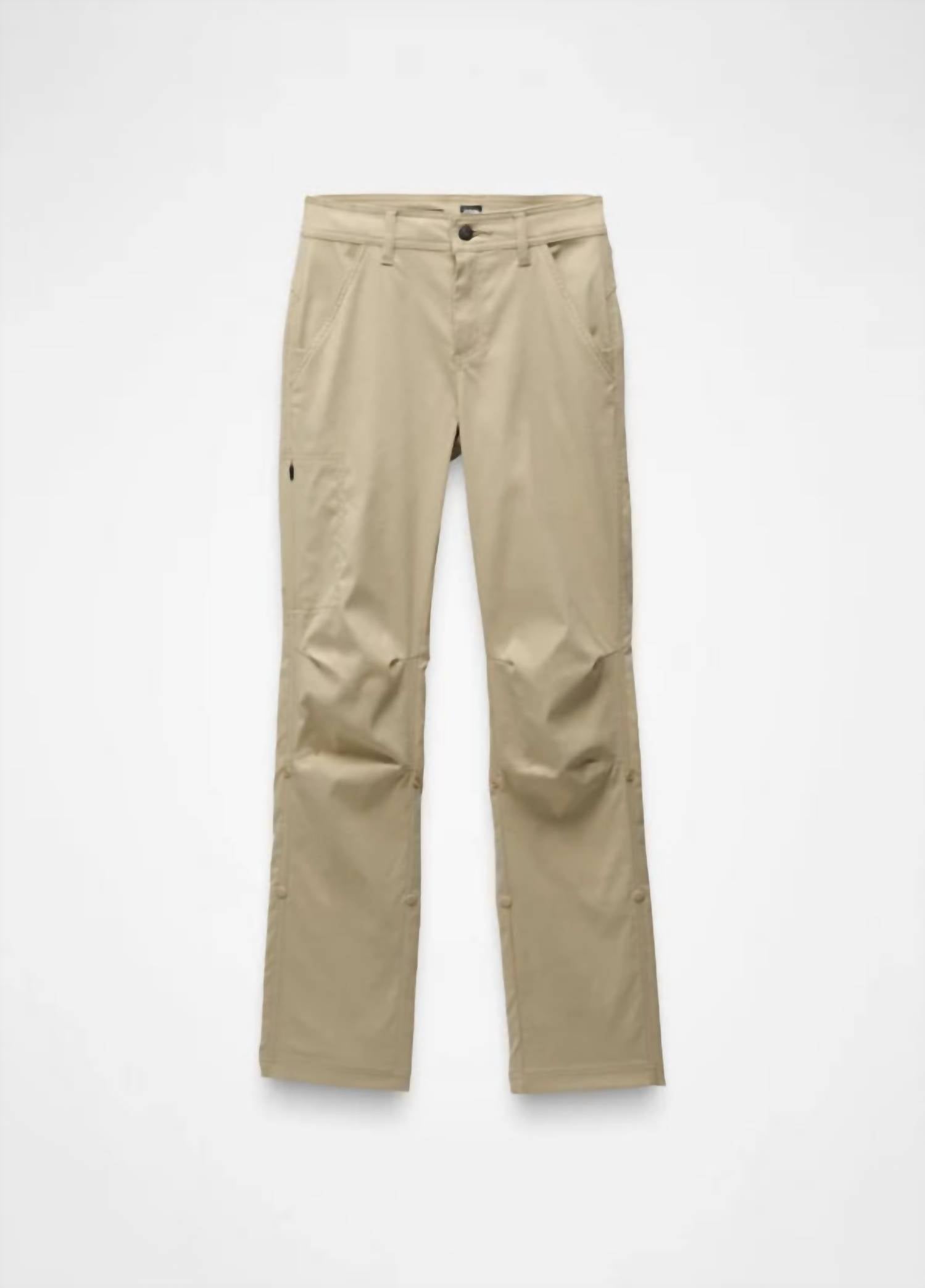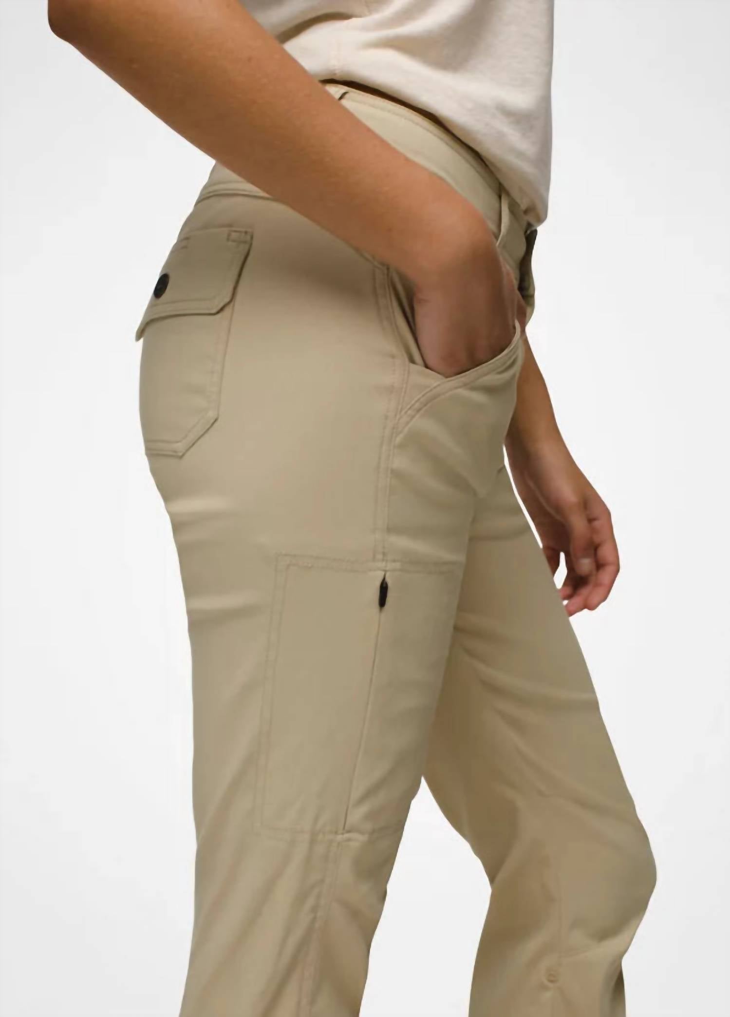 This straightleg pant is both stylish and comfortable. Did we mention the fit is perfection? Introducing the Stretch Zion Mid Rise Pant by prAna, crafted for versatility and style in a sandstone hue. These straight leg pants boast a high-rise fit with excellent stretch, durability, and sun protection, thanks to a 97% Nylon and 3% Elastane blend. Closure is a zip closure, and they are imported and feature snap adjustable pant lengths, adding to their dynamic appeal. With five-pocket styling, including a side zipper pocket and patch back pockets with flap closure, they are machine washable and can be tumble dried making them ideal for travel and outdoor adventures.