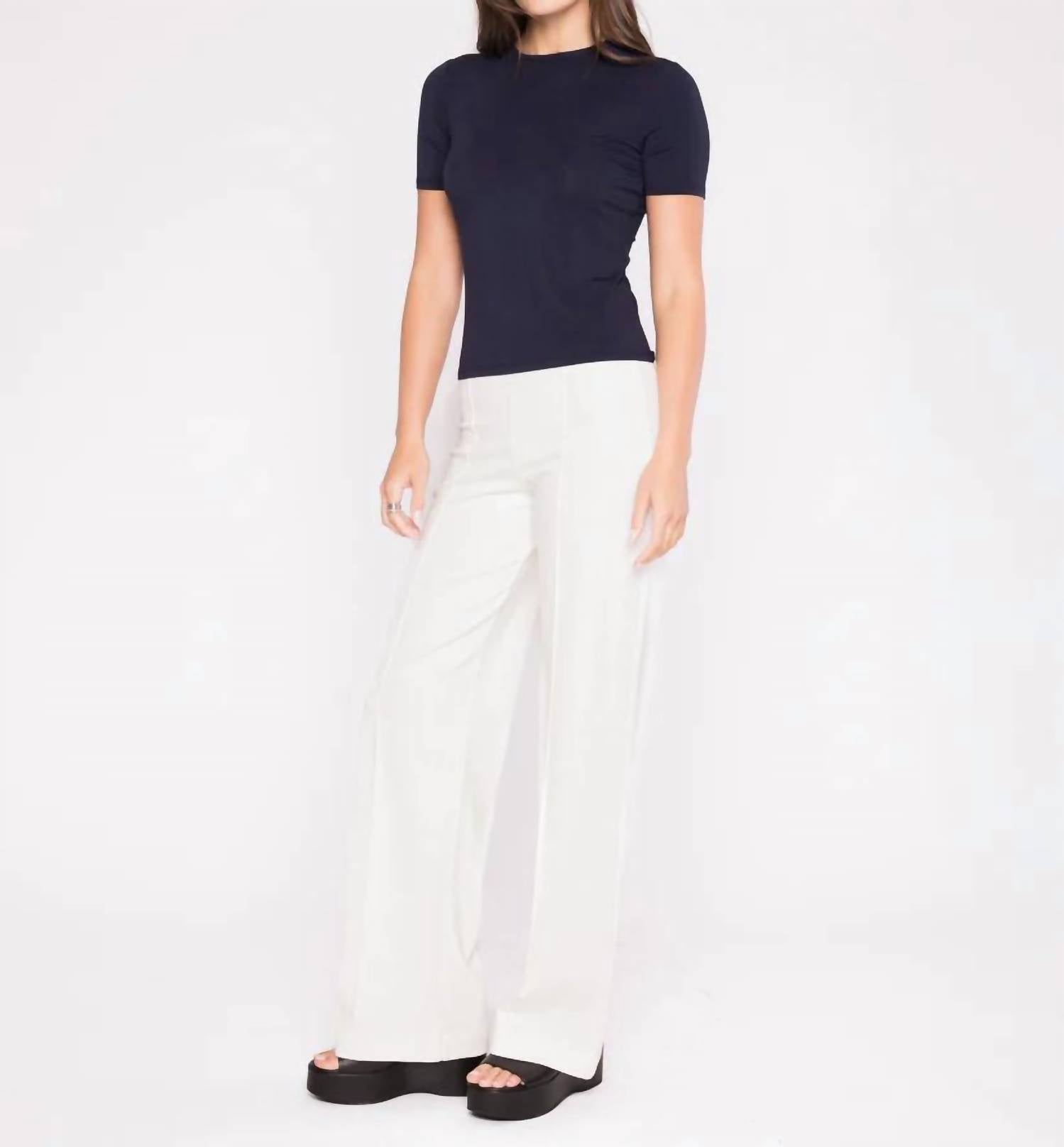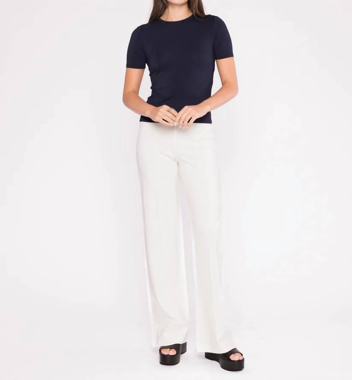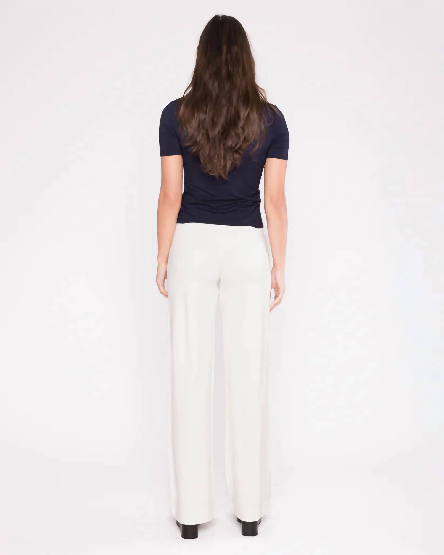 A straightleg pant that workes season after season. Dress these up with your favorite blouse or keep it casual with your go-to tee. Ideal choice for a minimalist fall wardrobe. Designed with a high-rise waist and a flattering straight leg, offer a regular fit made from luxe ponte knit. Composed of 68% Viscose, 27% Nylon, 5% Stretch. Pull-on style. Dry clean recommended, or hand wash and lay flat to dry. The inseam varies by size, ensuring a versatile fit for every height, with model Lea, at 5'8", wearing size 2 (S) for reference.