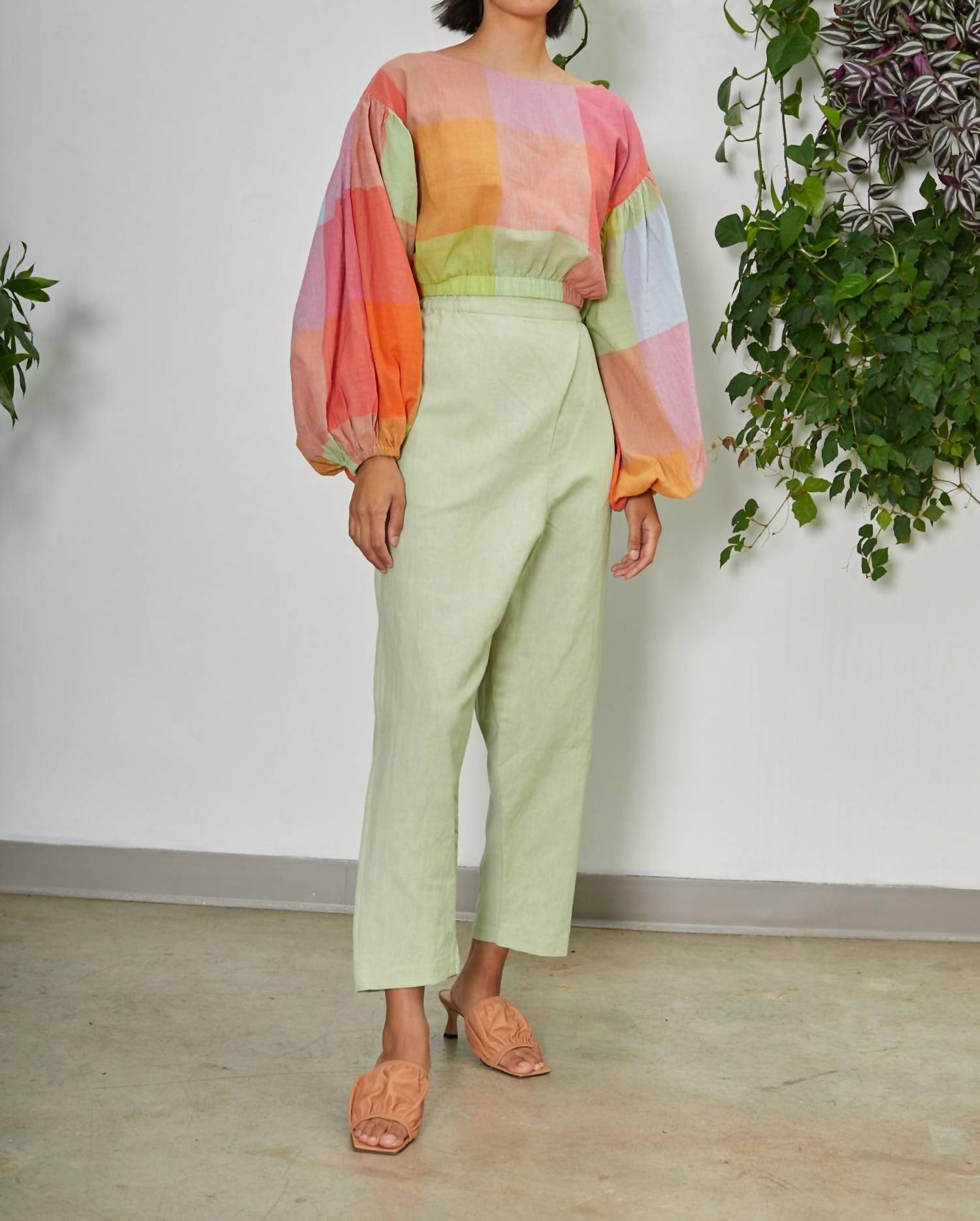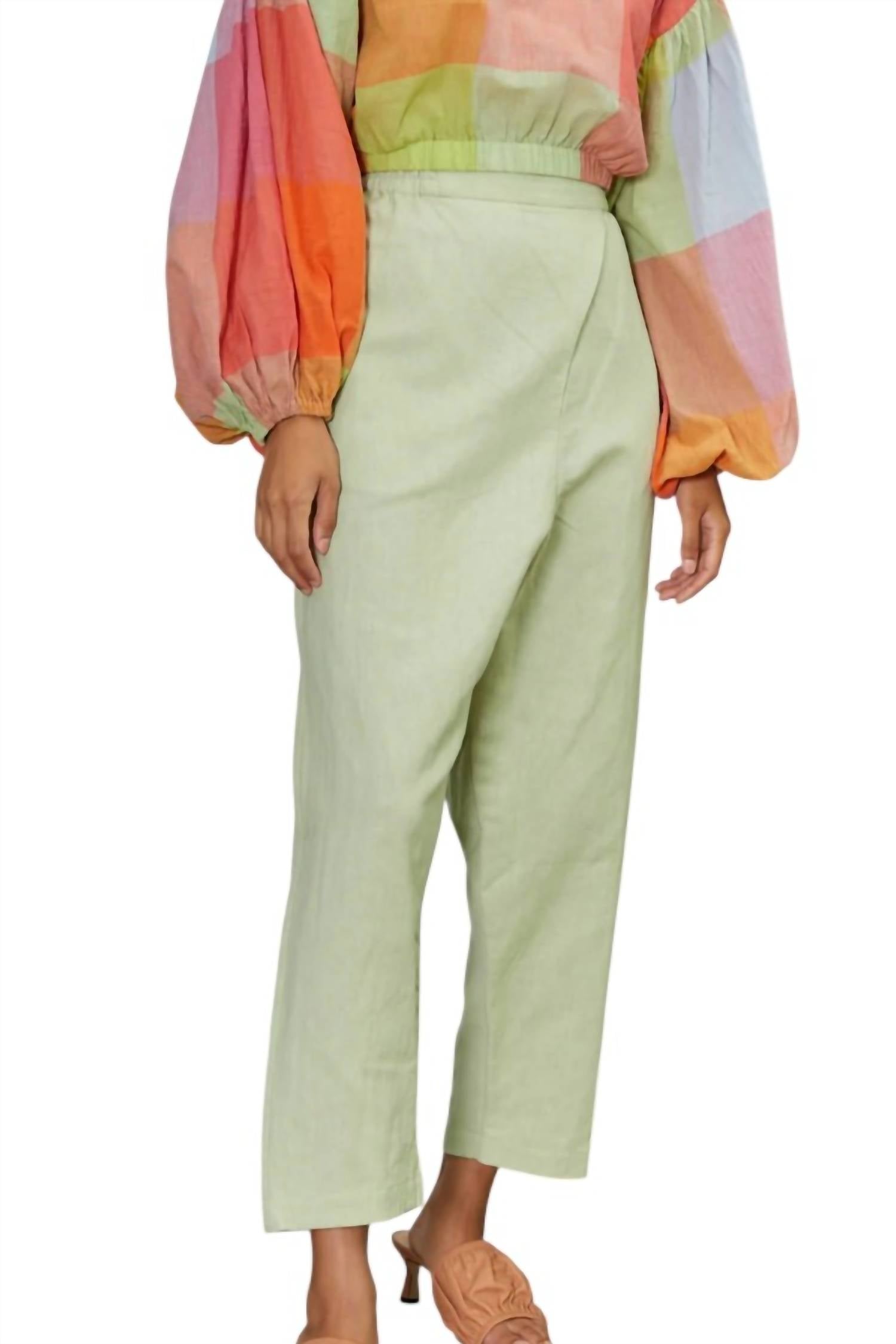 A straightleg pant that workes season after season. Dress these up with your favorite blouse or keep it casual with your go-to tee. Elevate your wardrobe with the Sunday Straight Leg Pants by Rujuta Sheth in a refreshing Mint hue, perfect for minimalist spring styles. Crafted from breathable 55% Cotton and 45% Linen, these pants feature a high-rise waist and a comfortable pull-on closure for easy wear. With functional pockets and a sleek straight-leg silhouette, they are both stylish and practical. Designed in New York and handcrafted in India, these pants are fair-trade certified, reflecting the brand's commitment to sustainable practices. Available in sizes XS to 2XL, with waist measurements ranging from 25" to 35". For care, dry clean or hand wash in cold water and hang dry indoors.