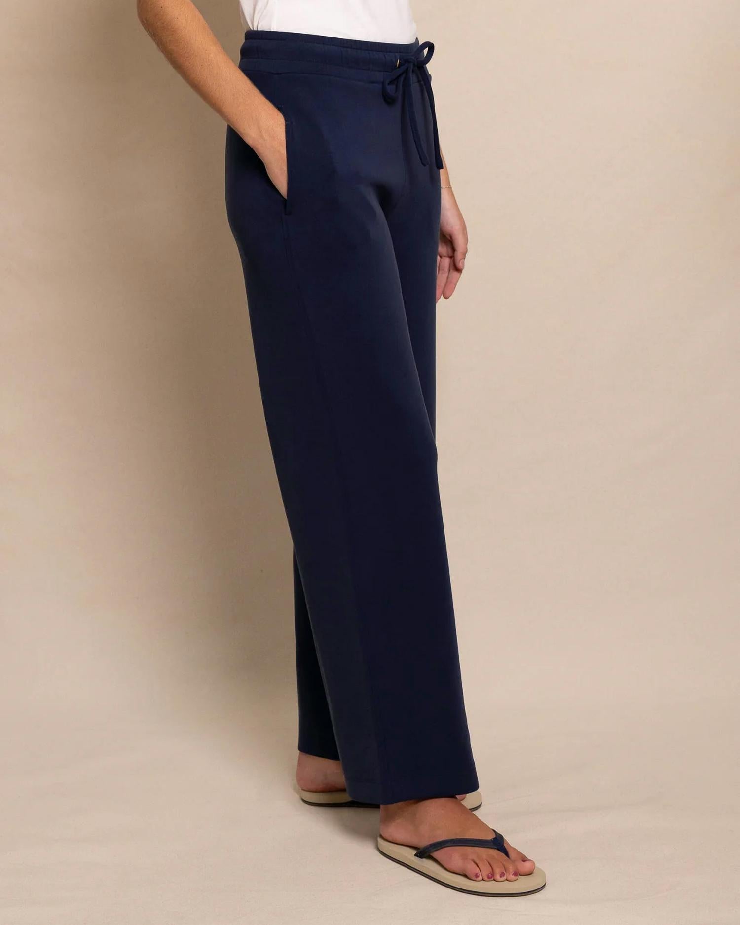 This straightleg pant is both stylish and comfortable. Did we mention the fit is perfection? Introducing the Levitt Lounge Pant by Southern Tide, a perfect blend of comfort and style in Dress Blue. These straight-leg pants feature a high-rise elastic waistband with a tie closure for adjustable comfort and a relaxed fit, resting at a 29" inseam. Crafted from a buttery soft blend of 53% Polyester, 40% Modal Rayon, and 7% Spandex, they offer practical side pockets for everyday functionality. Care for this versatile, minimalist piece by hand washing and line drying to maintain its luxurious feel.
