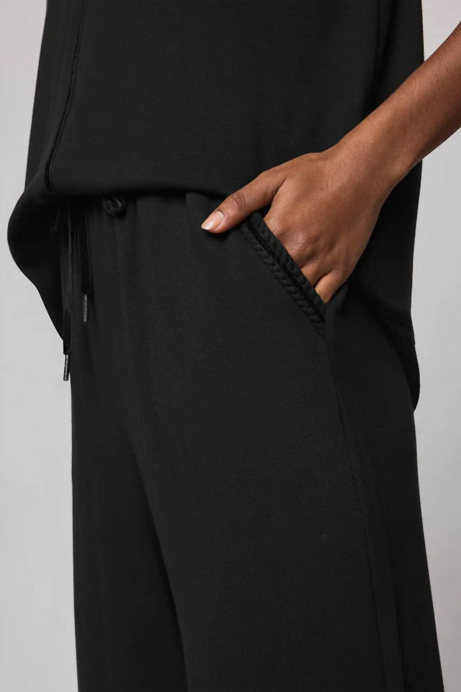 A perfectly tailored straight leg that you'll want in every color! Introducing the Supersoft Trim Pants by Splendid, the ultimate blend of comfort and minimalist style. These wide-leg lounge pants in a solid black design feature a relaxed fit and a high-rise, pull-on closure for easy wear. Composed of 95% LENZING™ ECOVERO™ Viscose and 5% Elastane, these relaxed-fit pants ensure a soft touch and lasting durability. With braided trim details along the pockets, a 31.5" inseam, and being fully machine washable, they are perfect for a laid-back spring vacation.