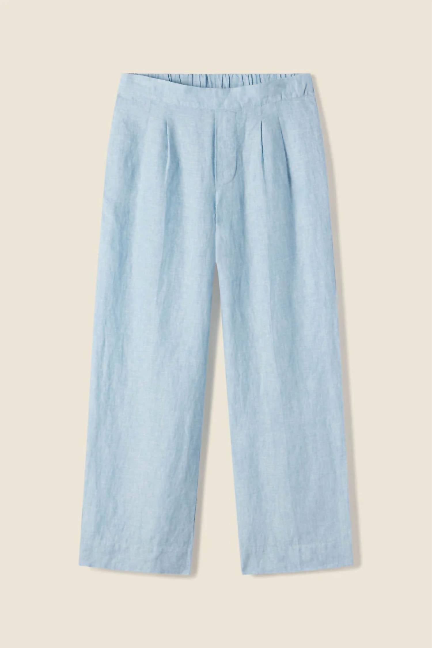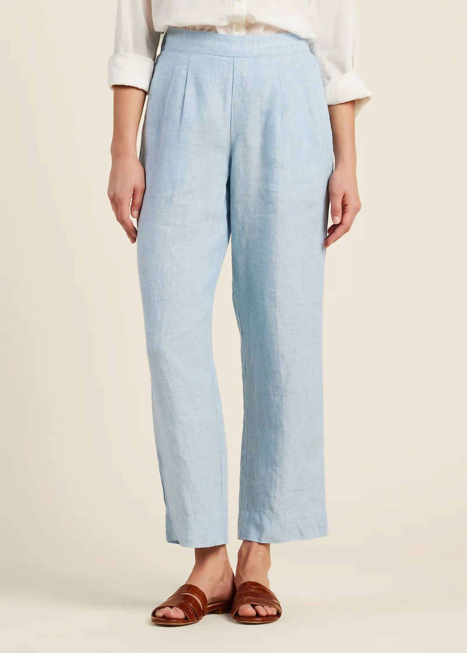 A perfectly tailored straight leg that you'll want in every color! Introducing the Leigh Pull-on Pant by TROVATA, crafted for effortless style with a minimalist touch. This women's pant is made from 100% linen, perfect for spring vacations with its breathable material and wrinkle-resistant quality. Designed in a high-rise, straight-leg style, it features convenient side pockets and a faux fly, all in a solid sky linen hue. Manufactured in California, it offers easy care with machine wash cold, separate tumble dry low, and medium iron as needed. Model is 5’7” and wearing a size S.