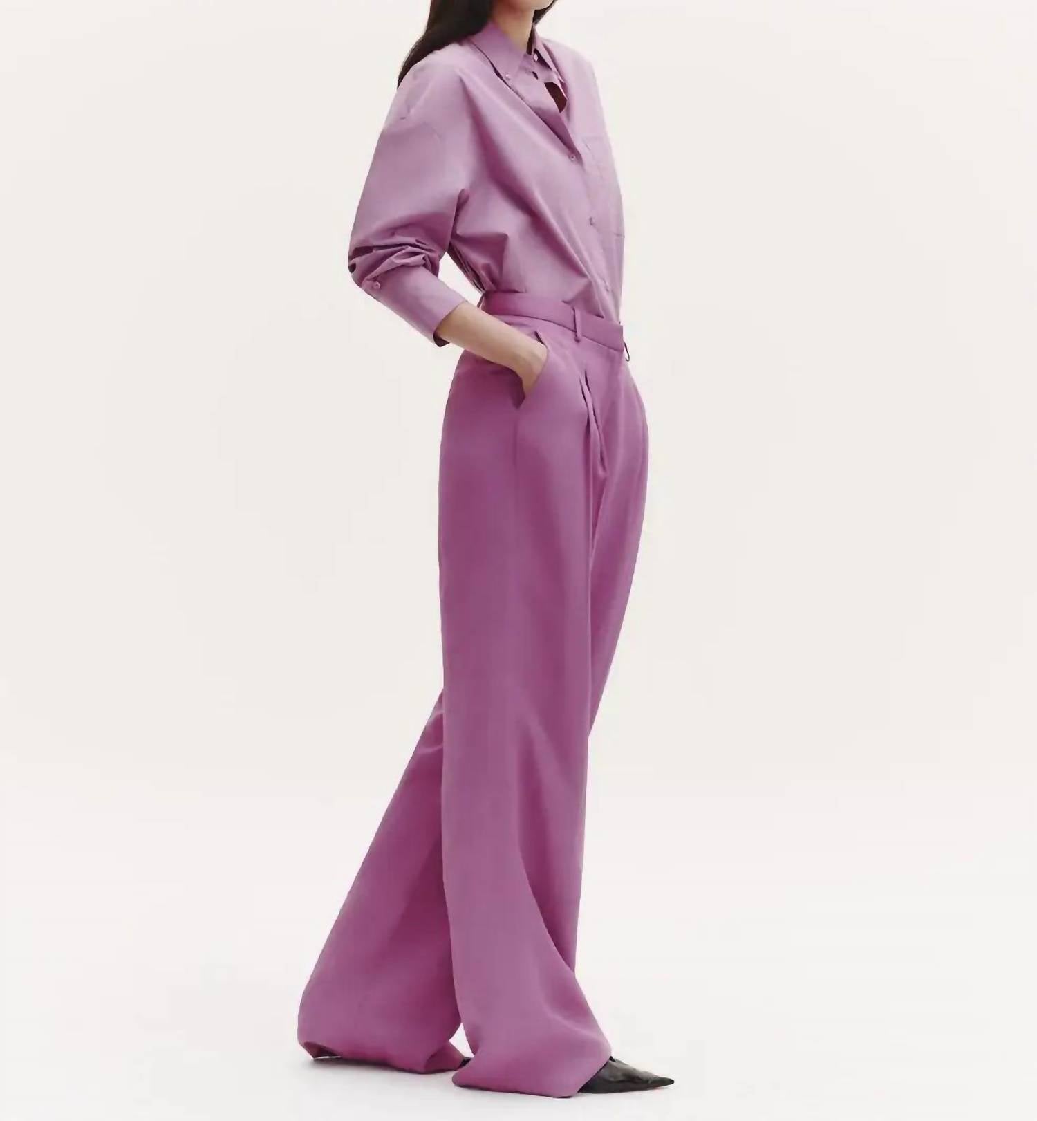 A straightleg pant that workes season after season. Dress these up with your favorite blouse or keep it casual with your go-to tee. Discover the Sulli Mid-rise Straight Leg Pant by TWP, a chic addition to your spring wardrobe perfect for workwear or travel. These lilac trousers are crafted from a coated viscose linen blend, offering a satiny sheen with the natural weight of linen. Featuring a classic fit with a high-rise waist, wide leg style, and solid pattern, they include practical pockets and an inverted pleat design. Closure: Zip closure, complemented with belt loops and a hook and bar closure. Care: Hand wash and line dry.