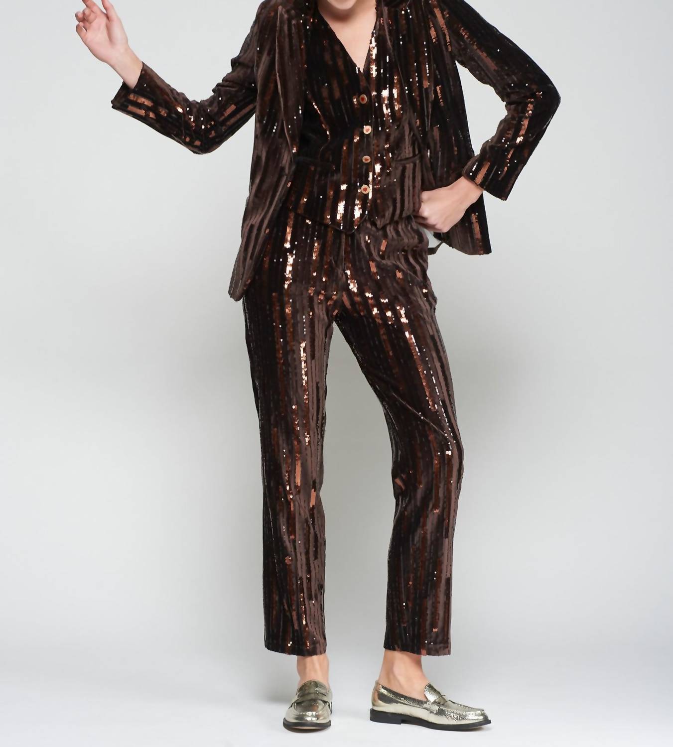 A perfectly tailored straight leg that you'll want in every color! Introducing the Straight Leg Sequined Pant by Vilagallo, a striking piece designed for women who love to make a statement. These relaxed fit pants in a rich chocolate hue feature a textured, sparkling finish that transitions effortlessly from day to night. Constructed from 97% Polyester and 3% Spandex, they offer both comfort and glamour with a flattering mid-rise waist and straight leg style. Closure: Button closure. Perfect for special occasions like engagements or New Year's Eve celebrations, these pants embody the trend of quiet luxury.