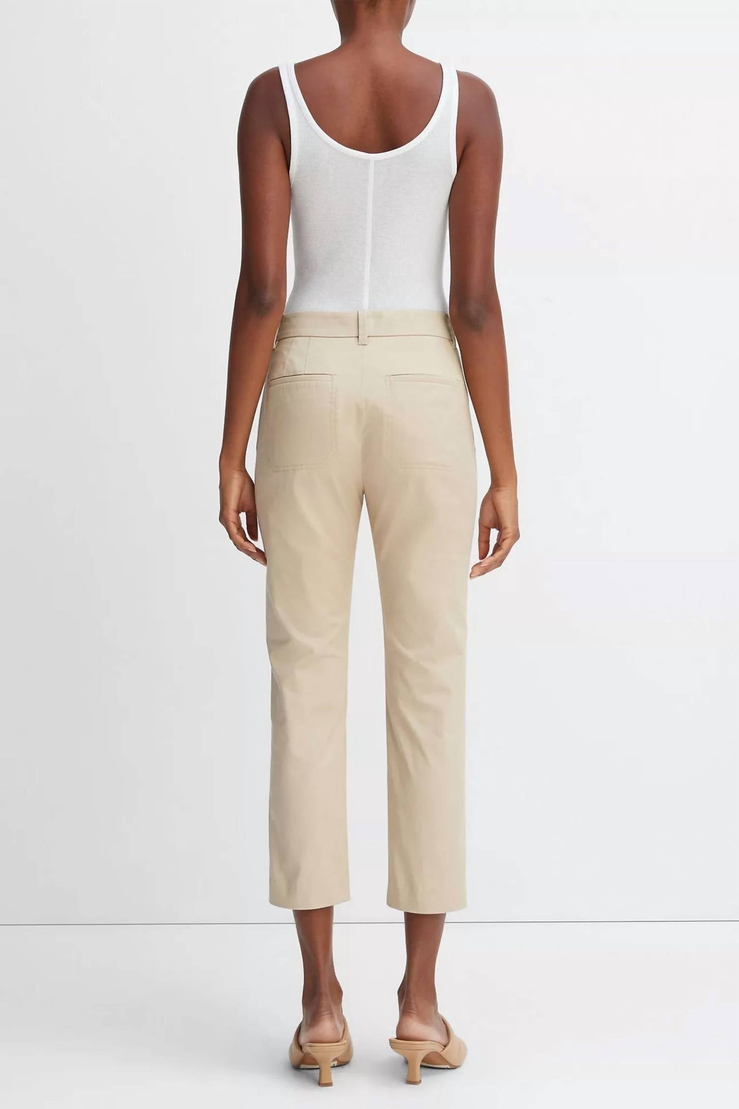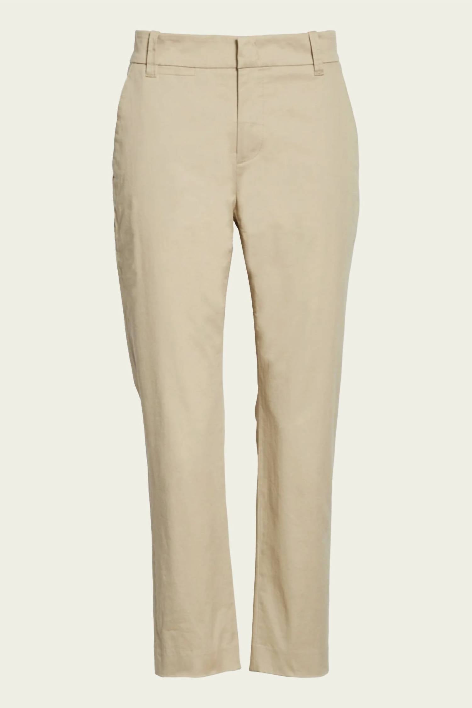 A straightleg pant that workes season after season. Dress these up with your favorite blouse or keep it casual with your go-to tee. Made from a smooth 98% Cotton and 2% Spandex blend, these chinos feature a mid-rise and slim fit, perfect for a modern, tailored look. Their garment length of 36.5 inches and 27.5-inch inseam make them ideal for a cropped fit above the ankle. Equipped with side slash pockets, a coin pocket, and back welt pockets, they close with a hook/zip fly and belt loops, completing this solid color essential.