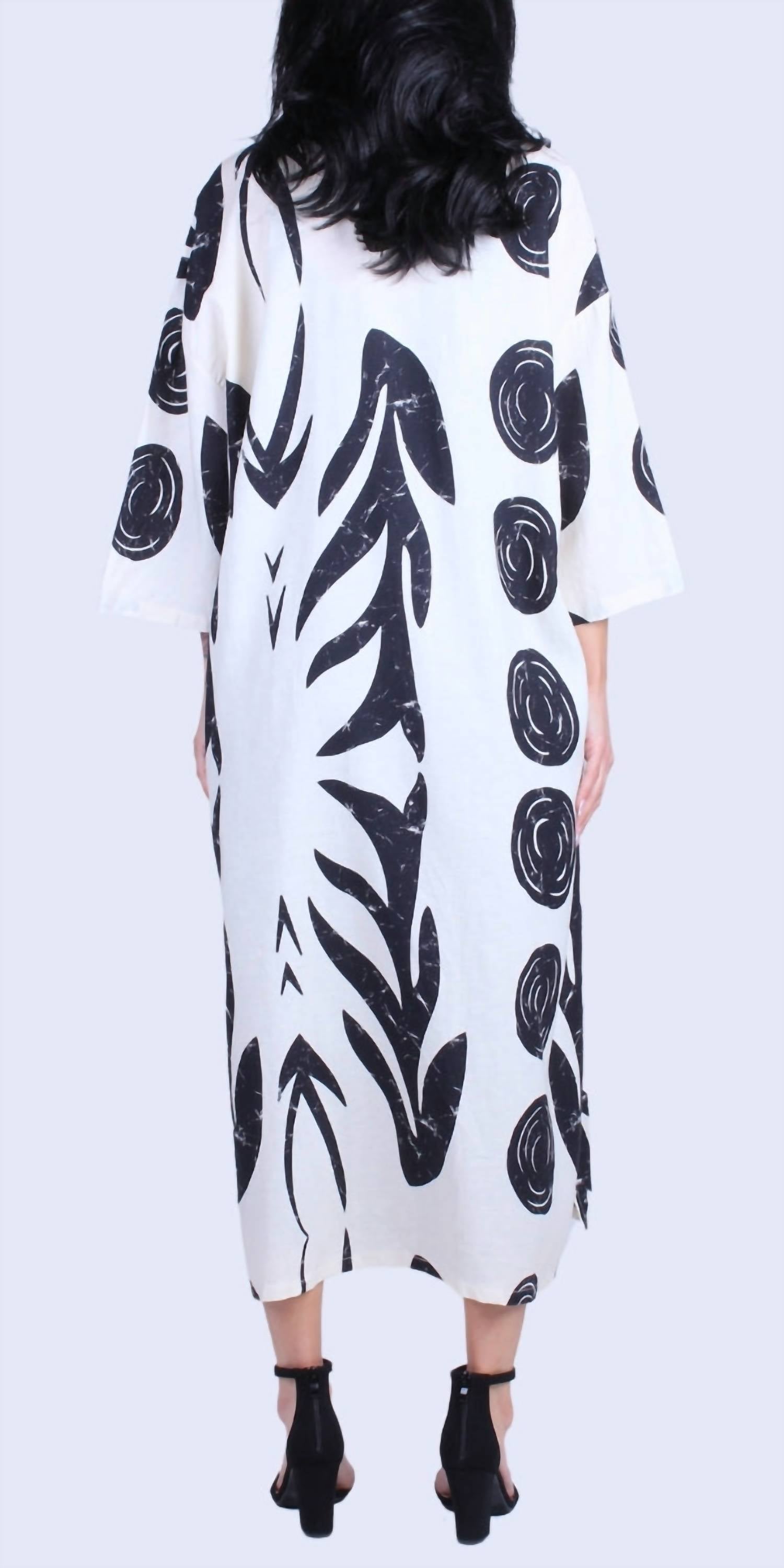 A classic fit that works just as good buttoned as it does left open. Introducing the Esotico Long Linen Duster by GIGI MODA, a chic addition to your wardrobe for effortless elegance. This cardigan features three-quarter sleeves and a bold tribal print, perfect for making a style statement. Crafted from a linen blend of 55% linen and 45% viscose, this piece is proudly made in Italy with a pull-on closure and convenient pockets. Care instructions include hand washing and line drying to ensure lasting quality. The model height is 5'7".